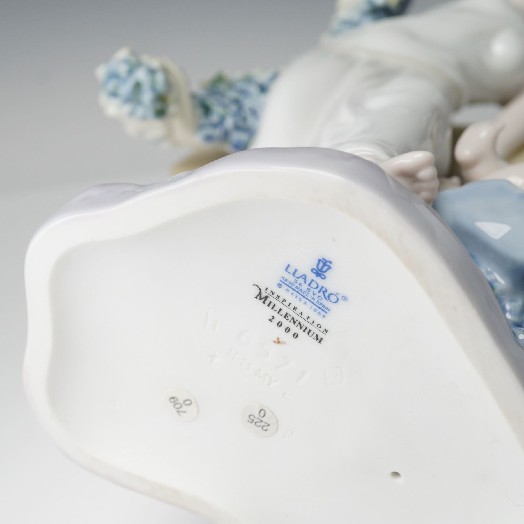 Handcrafted Lladro porcelain sculpture titled Rebirth, model number 6571. Features a graceful woman in a flowing gown standing beside a newborn child cradled within a garland of pastel flowers. Issued in 1999, marked with the special Lladro Millennium 2000 backstamp, and sculpted by Jose Luis Santes.