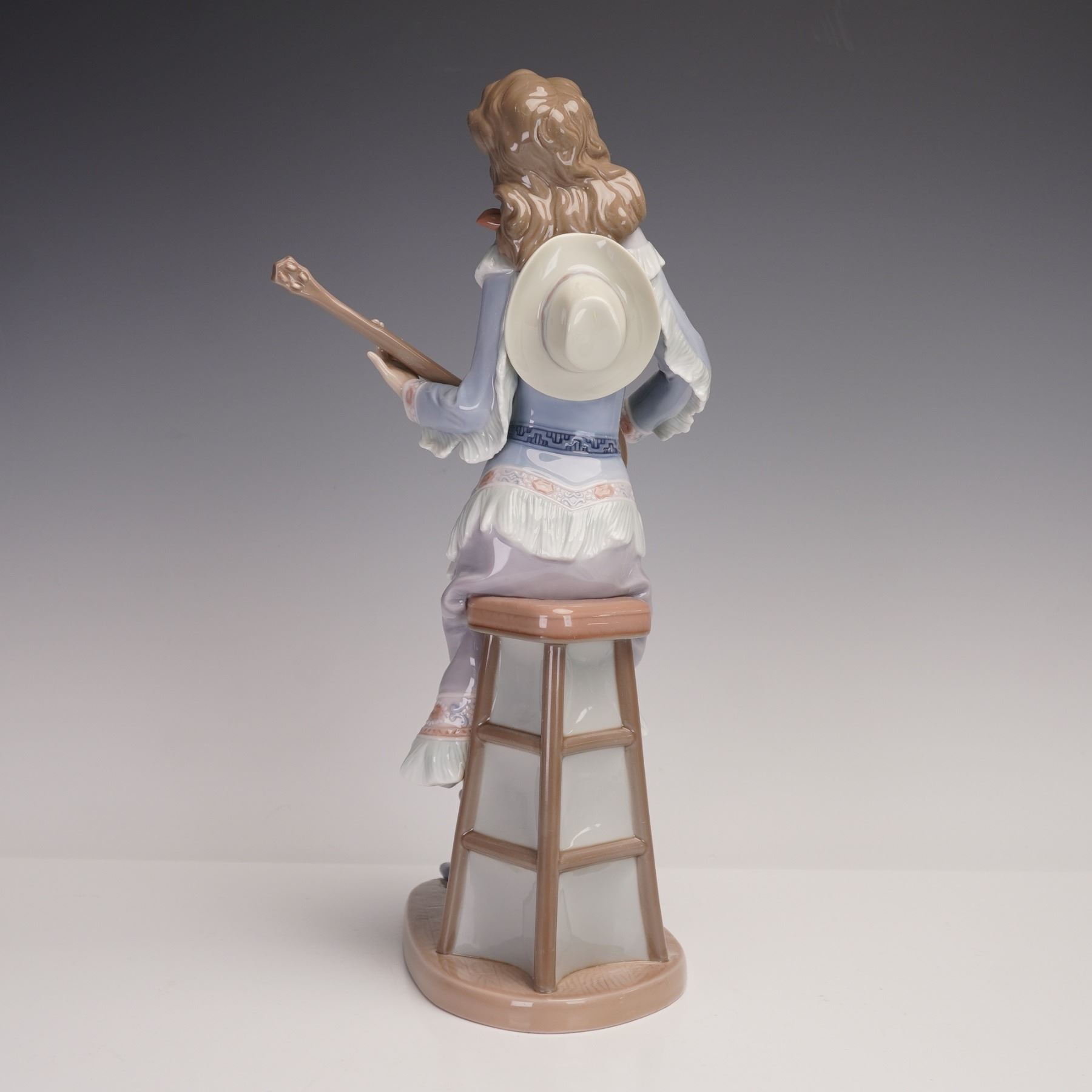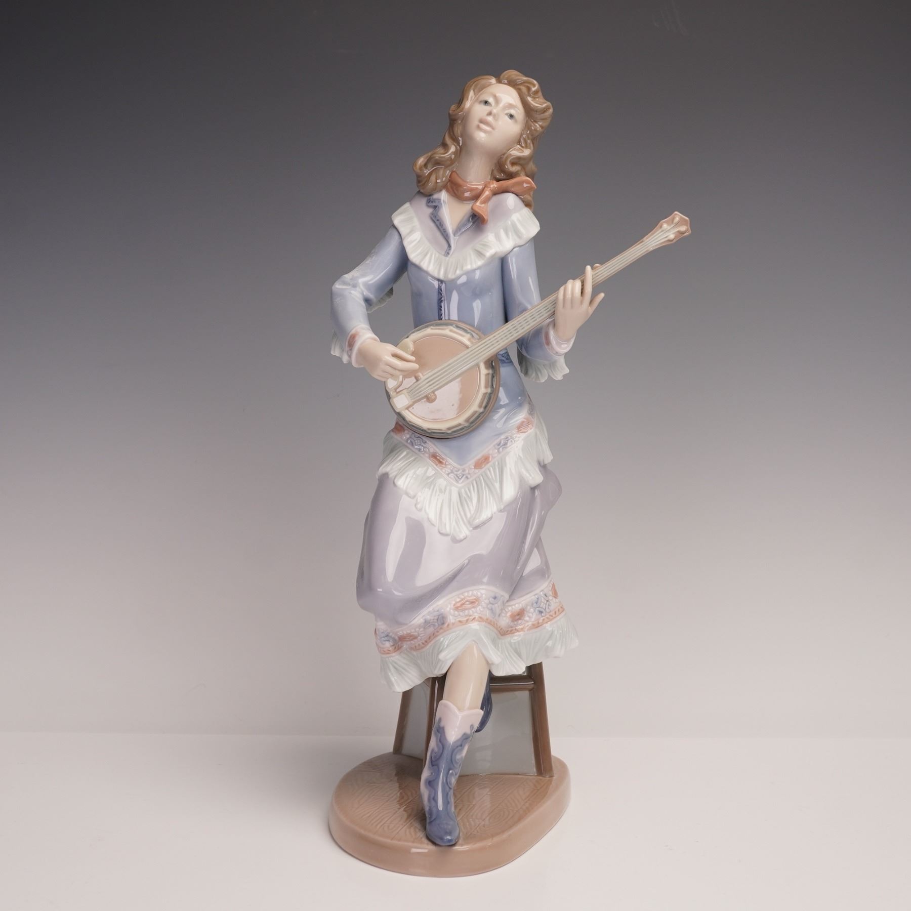Lladro Sweet Country is a striking porcelain sculpture numbered 1006340, designed by Joan Coderch, and produced between 1996 and 1998. It depicts a young woman in western attire seated on a stool playing the banjo. This glossy-finish sculpture is finely detailed, from her flowing hair and ruffled dress to the banjo and boots, capturing a sense of charm and musical spirit. The piece bears the authentic Lladro backstamp, making it a highly desirable retired work for collectors of Lladro porcelain.