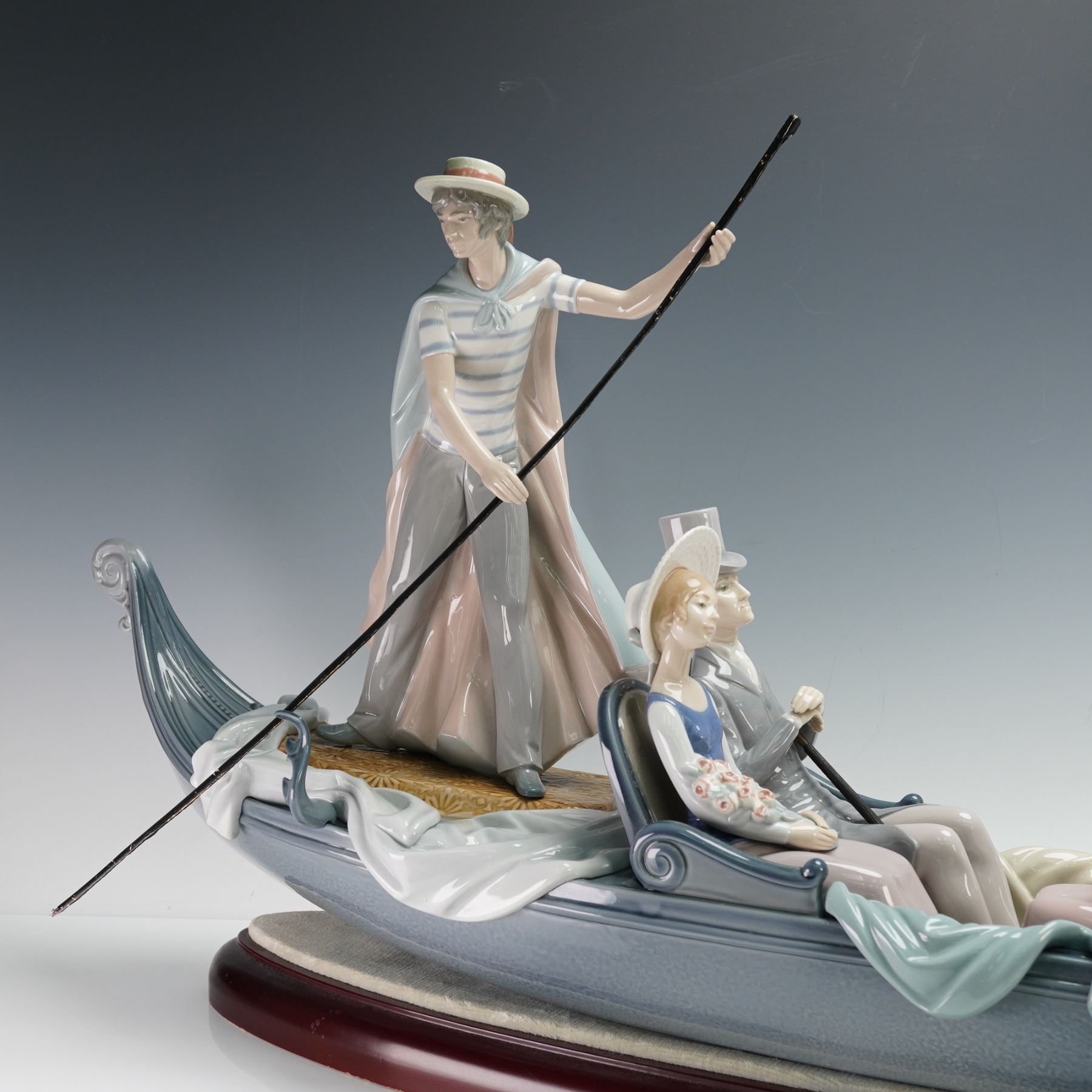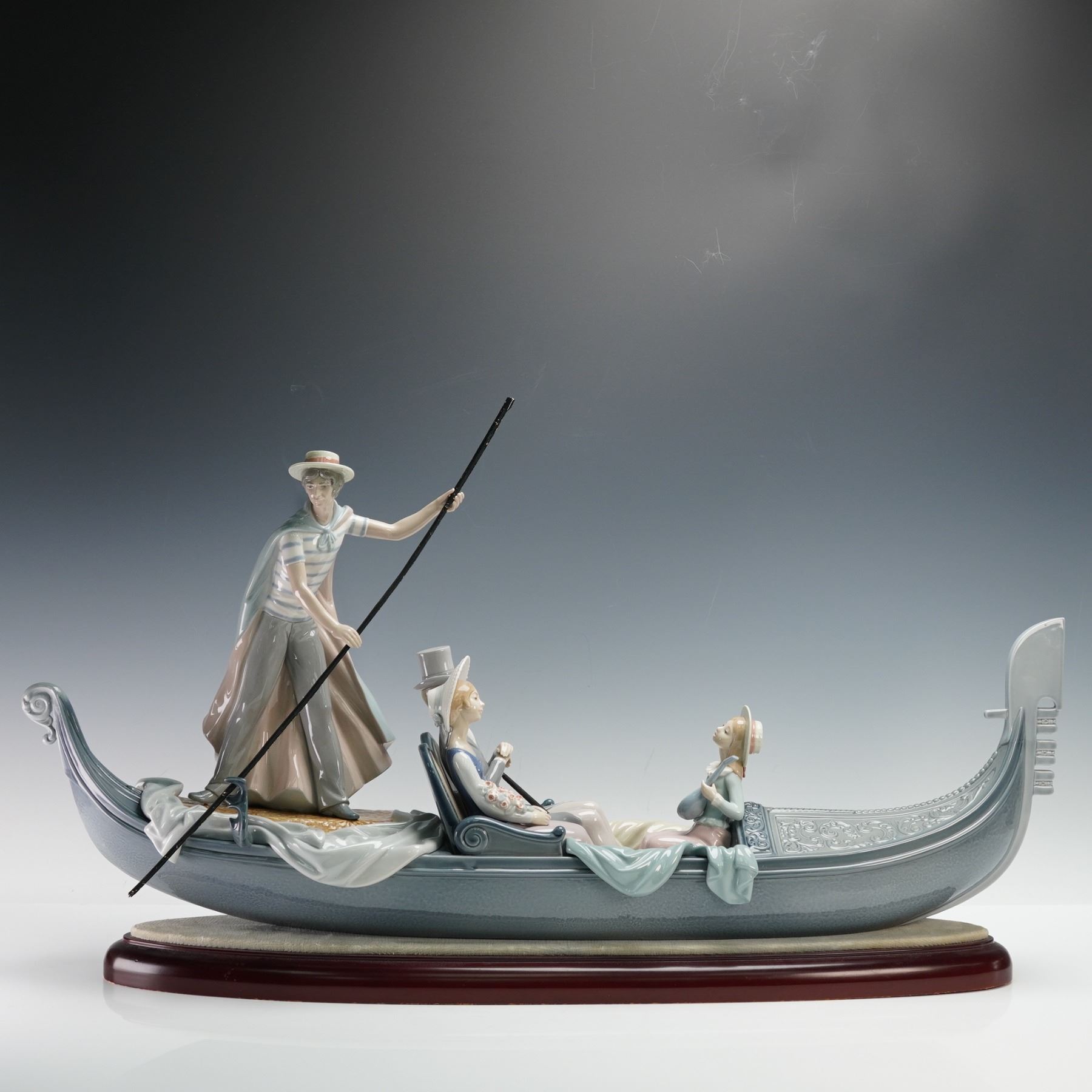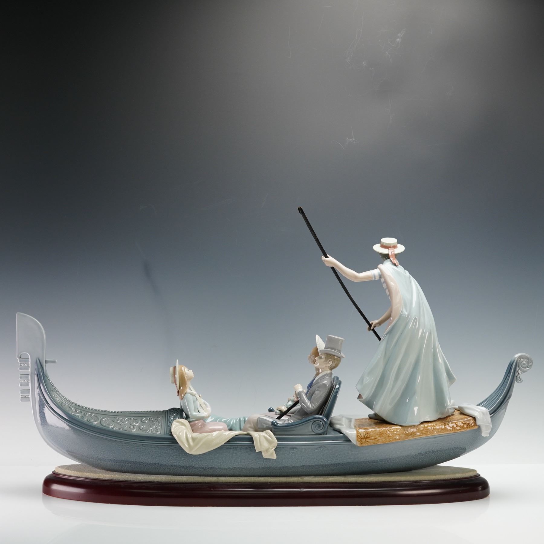 A glossy finish, numbered edition sculpture exquisitely crafted and presented on a fitted wooden base. This grand composition portrays a romantic Venetian scene with a gondolier gracefully navigating a gondola carrying elegantly attired guests. The figures exhibit refined detail and lifelike poise. Lladro backstamp.