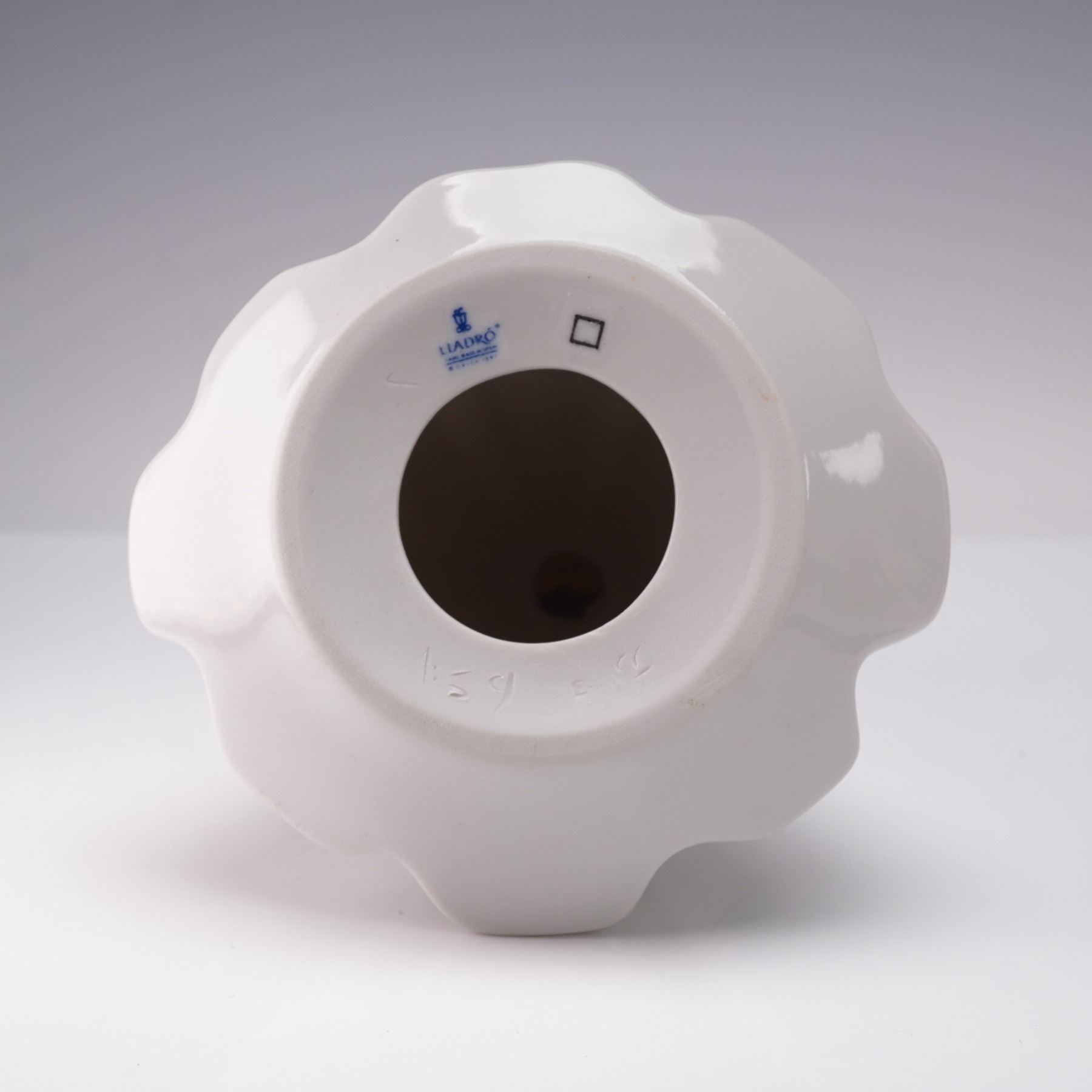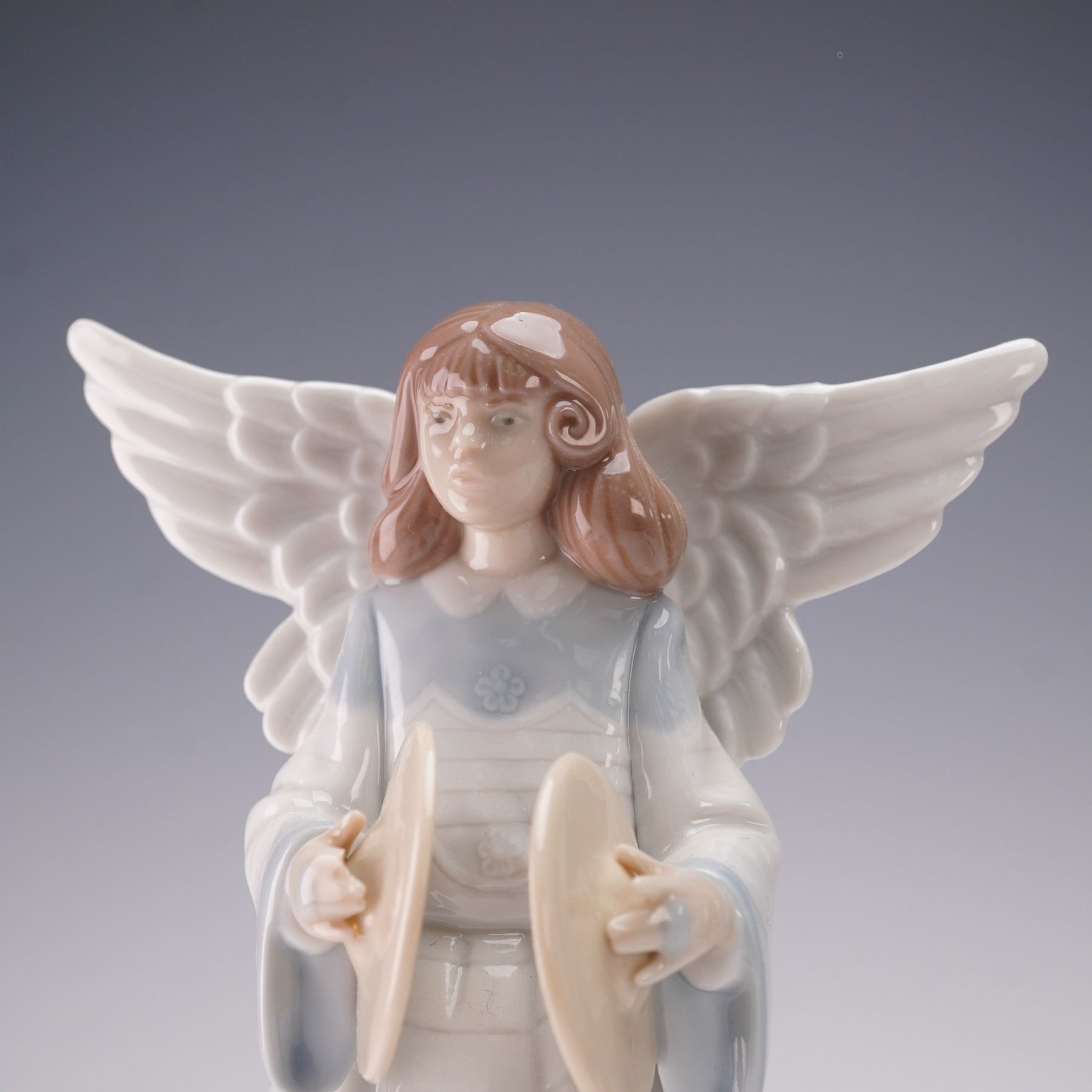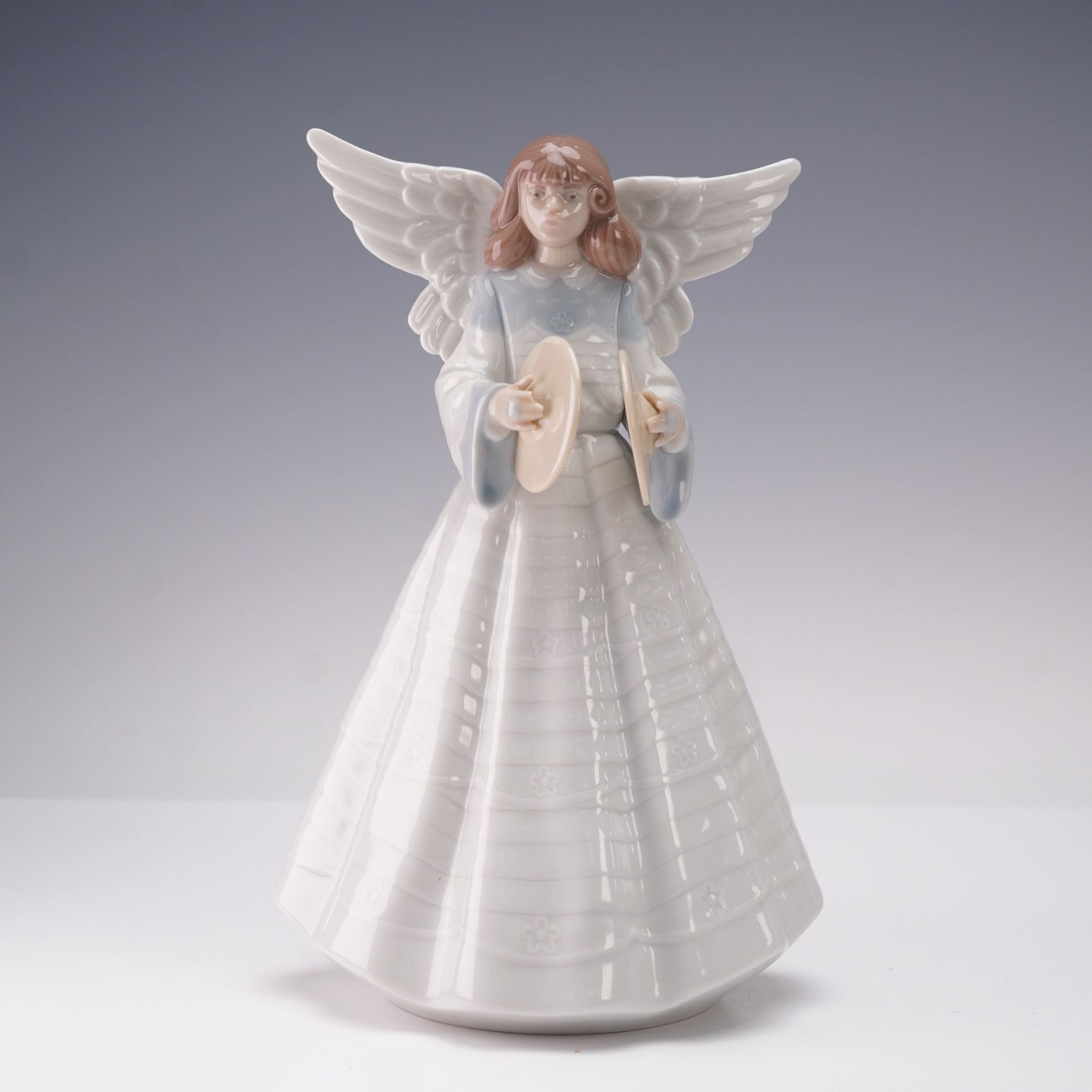 This piece depicts an angel with extended wings, dressed in a long flowing gown, holding a pair of cymbals. The figurine is finished in Lladro's signature glazed porcelain with soft pastel tones of blue, white, and beige. The underside is marked with the Lladro stamp.
