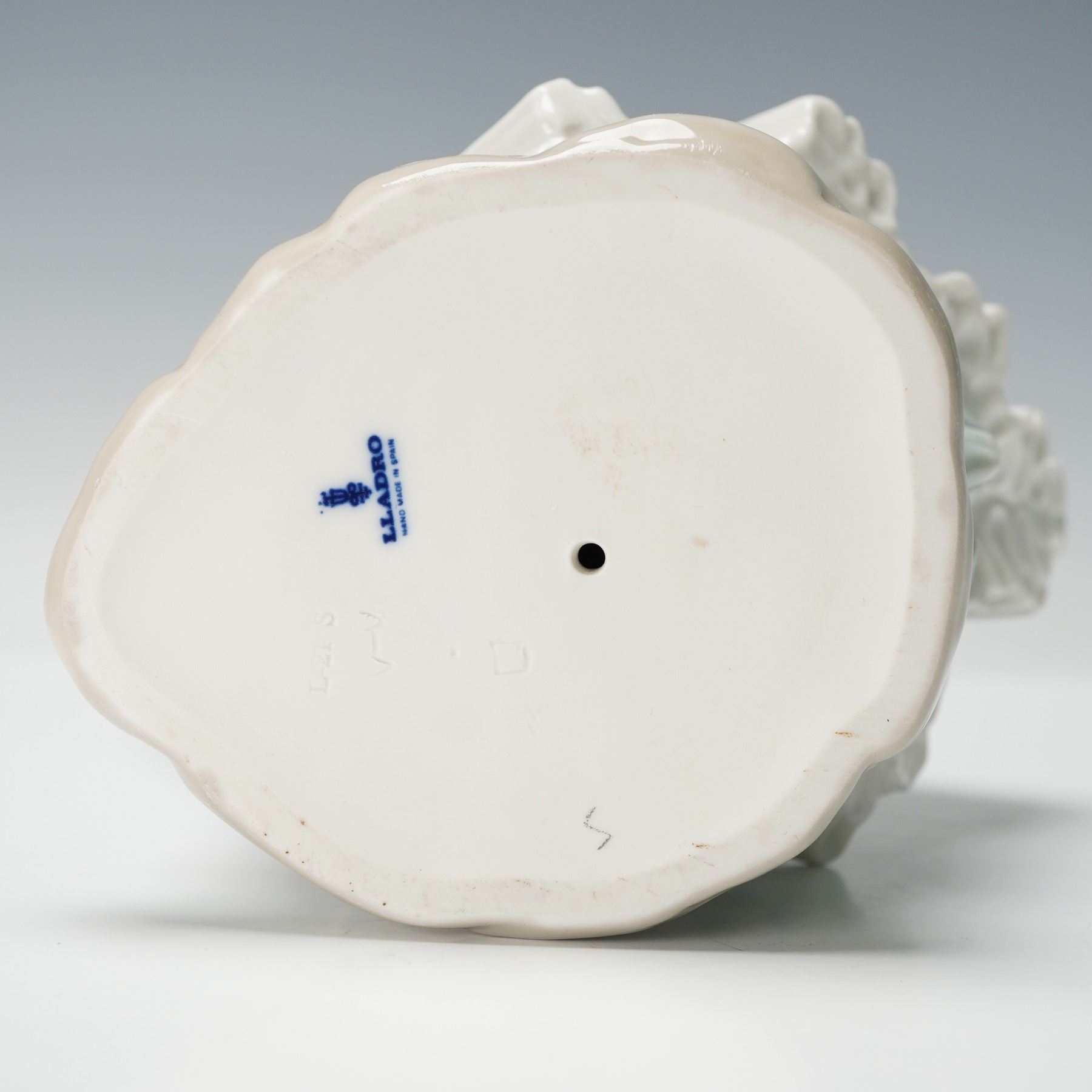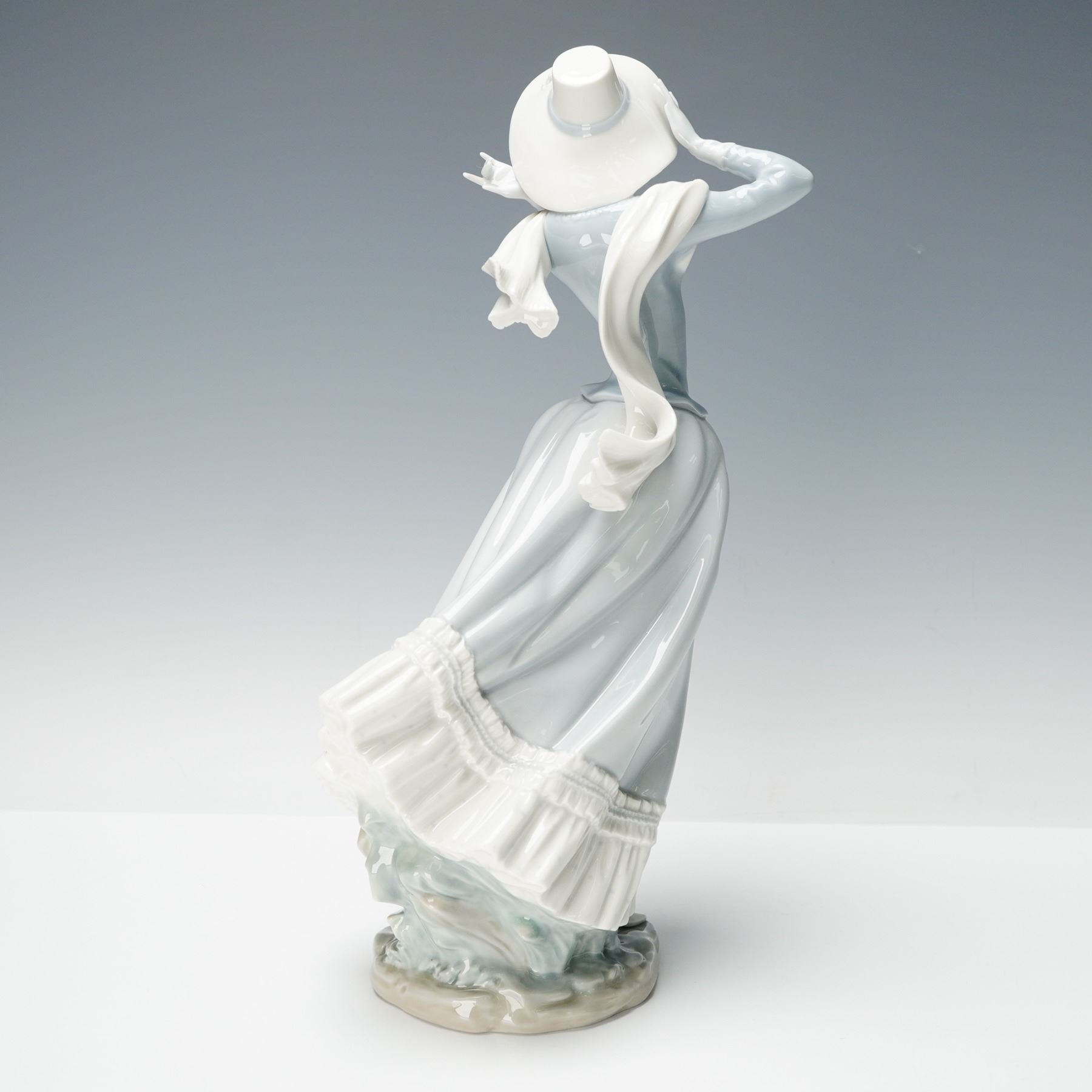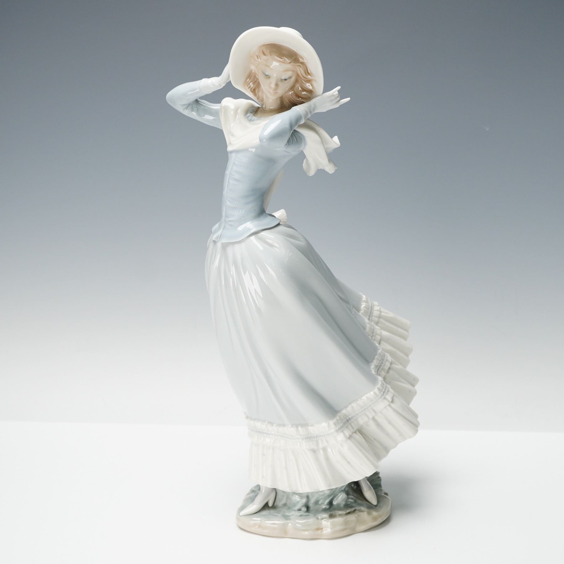 A glazed porcelain figurine depicting a young woman in a flowing pale blue and white dress, gracefully holding her wide-brimmed hat against the wind as her scarf and skirt billow around her. The piece showcases delicate sculptural detail and soft pastel glazing typical of the brand's craftsmanship. Marked on the underside with the blue Lladro stamp and impressed model number.