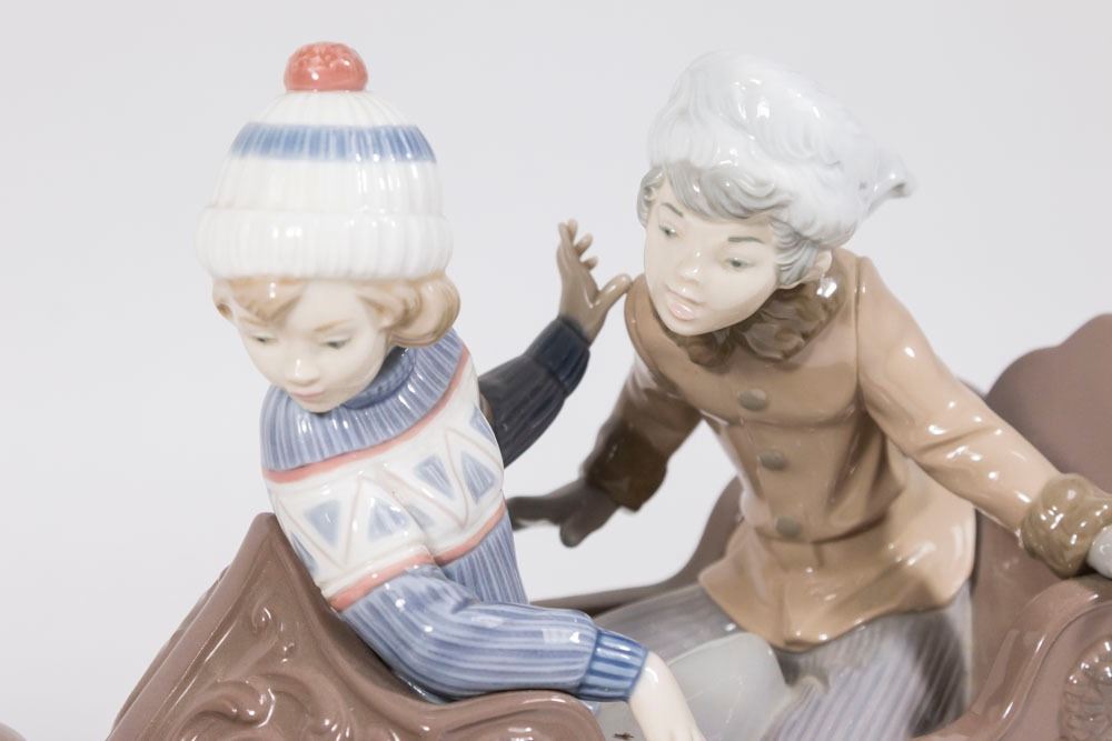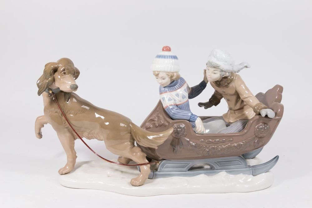 #2349M. Boy and girl in a sled being pulled by a Spaniel-type brown dog. Dog has leather rein attached to sled. Approx. 10" H x 18" W. (5037) Good condition.