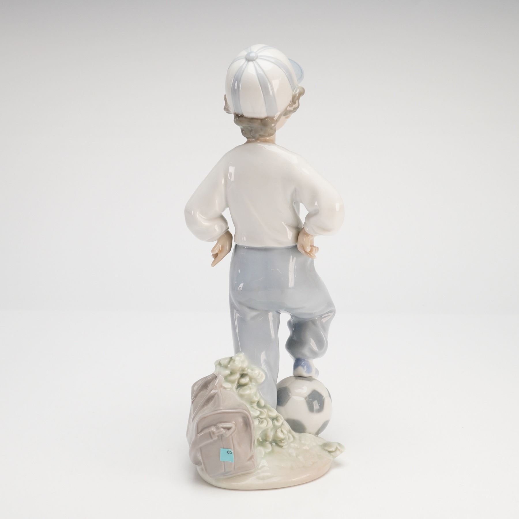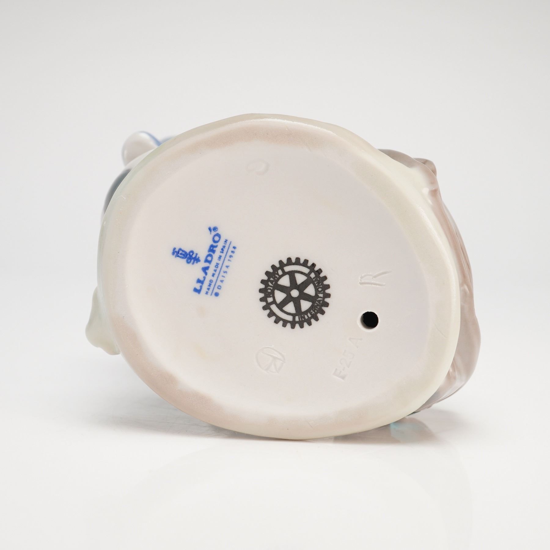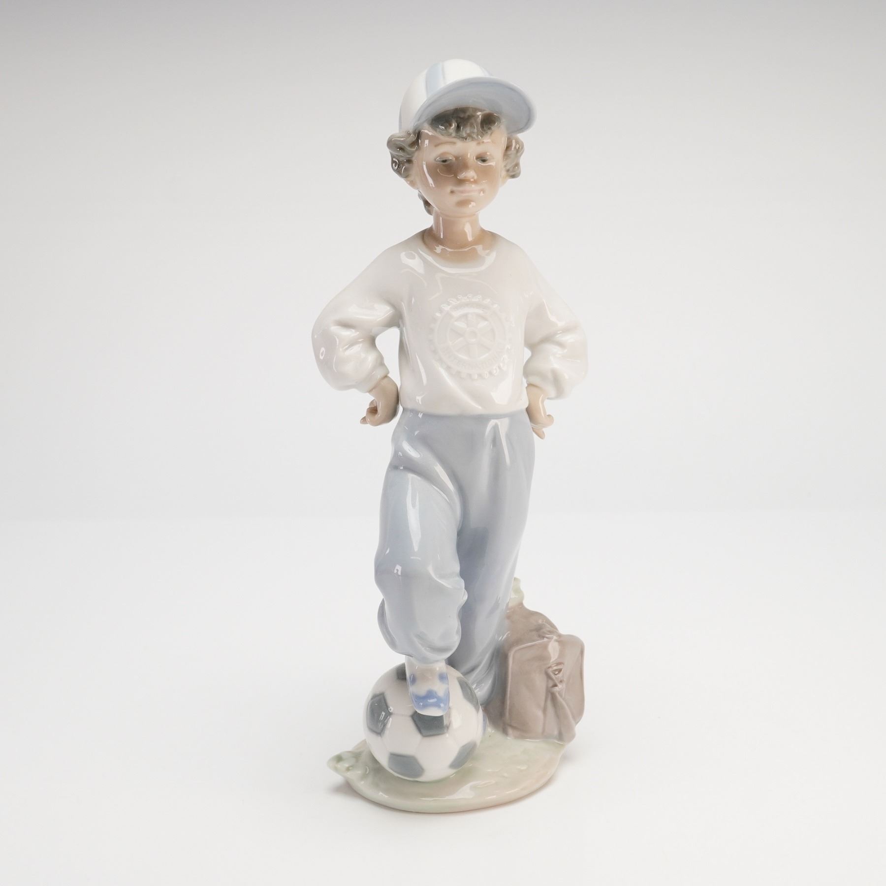 This Lladro glossy figurine model 7605, titled Goal!, was designed by Juan Huerta and issued in 1988. The porcelain piece depicts a young boy in a confident stance, wearing a white sweatshirt, light blue track pants, and a blue and white striped cap. His right foot rests on a soccer ball, and a sports bag is positioned on the base. This specific figurine is a special edition featuring the Rotary International emblem on the sweatshirt. The underside displays the blue Lladro factory mark, the Rotary International gear logo, and the copyright date (c) DAISA 1988. Incised marks include F-23 A and a script R, alongside hand-painted artisan marks. Height: 8.25 inches.