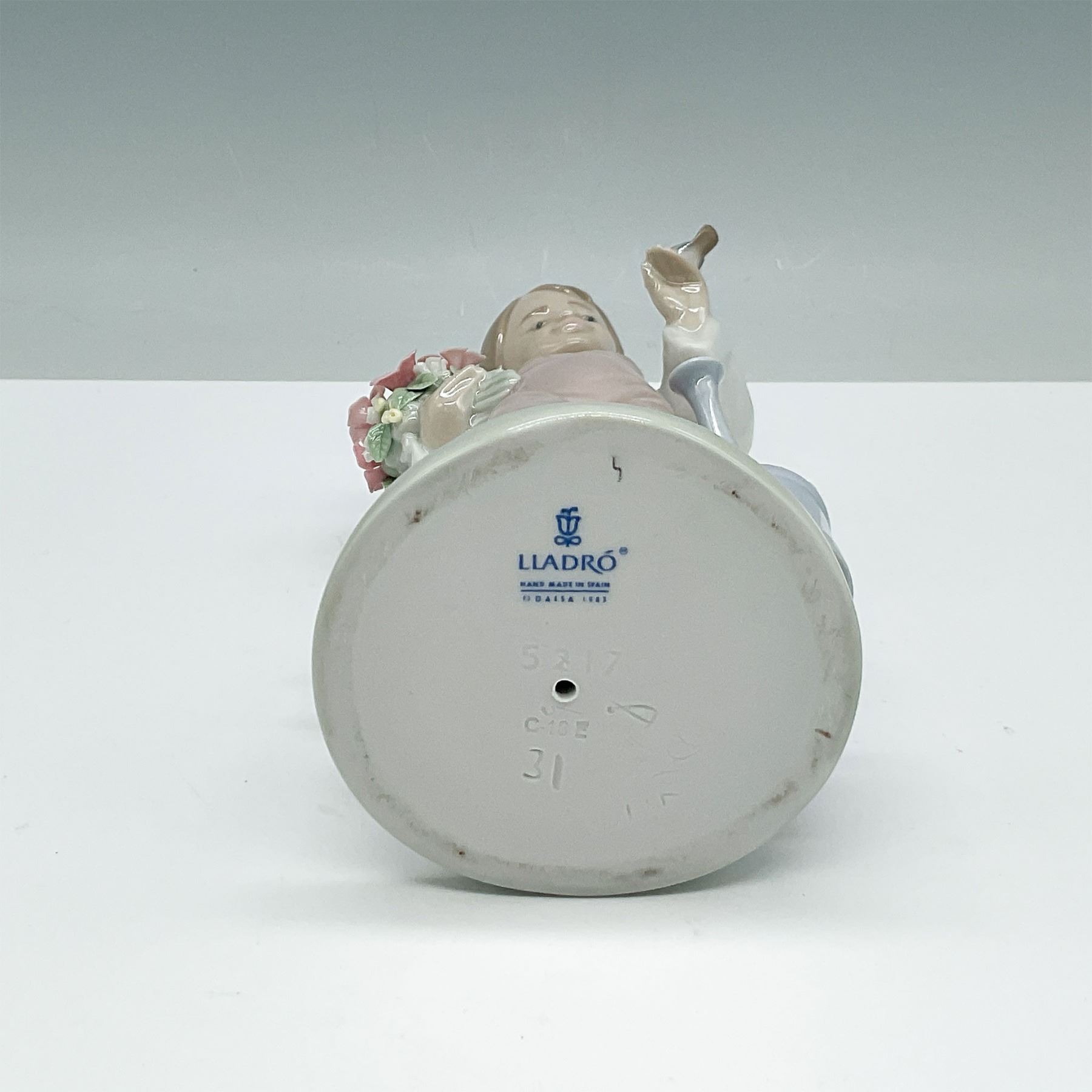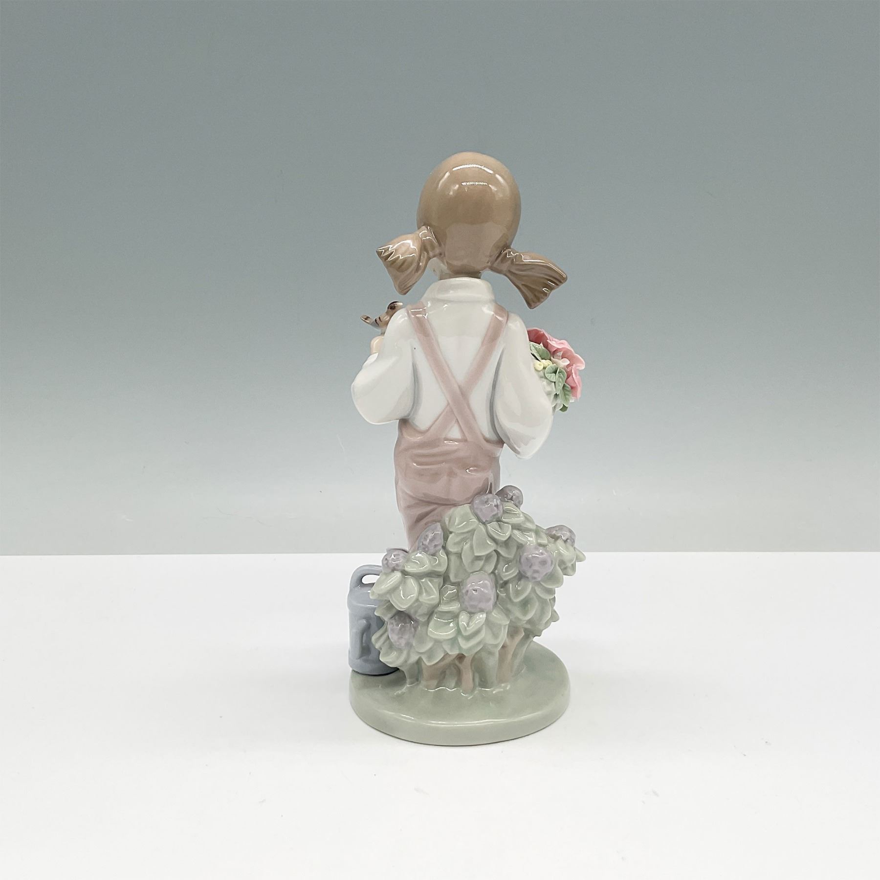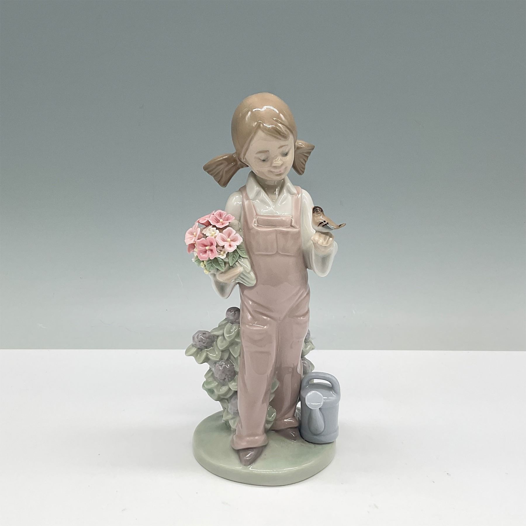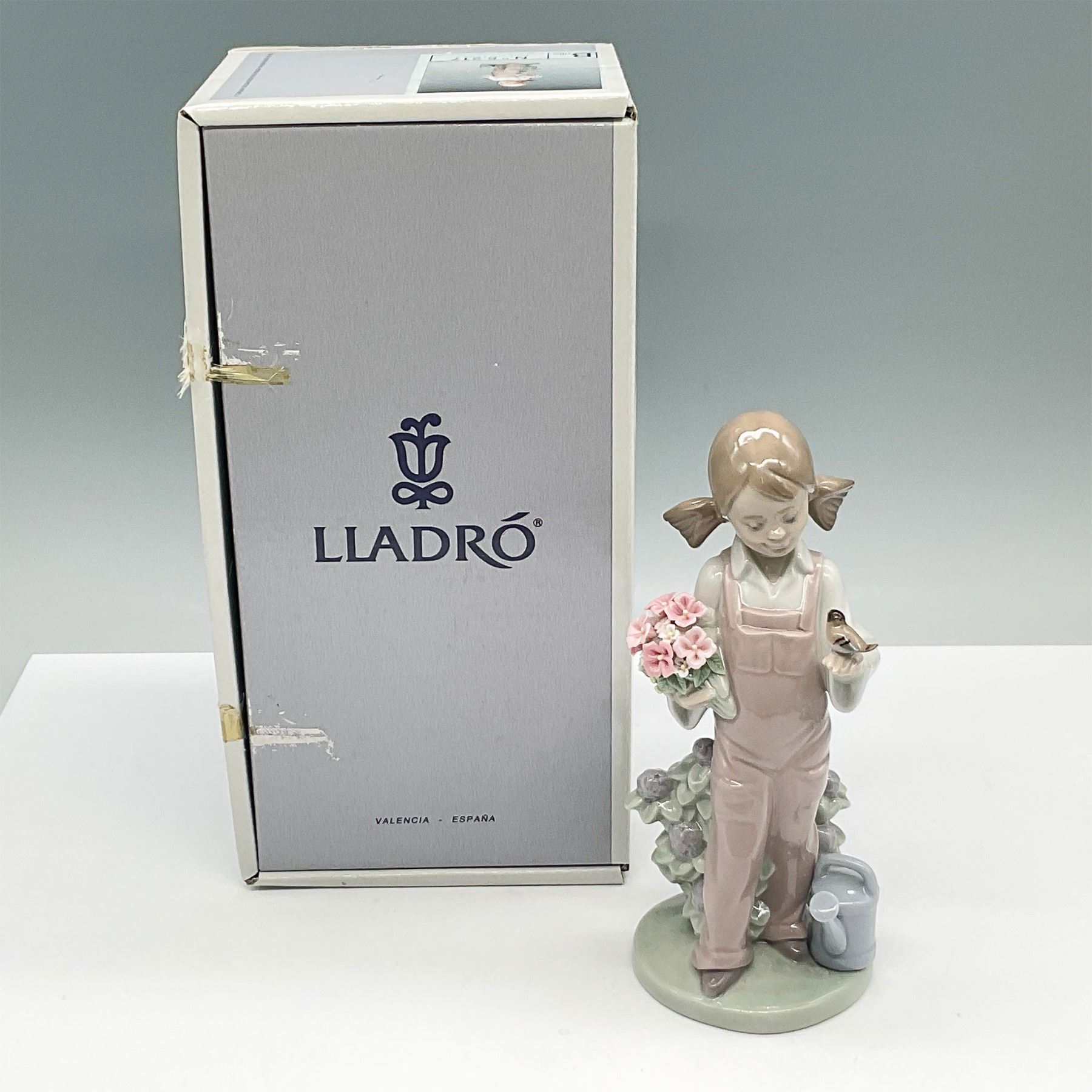 This charming Lladro porcelain Spring figurine, model number 01005217, depicts a young girl in pink overalls holding a bouquet of flowers and a small bird resting on her hand. Designed with delicate detailing, the piece is complemented by a watering can and blooming plants at her feet, showcasing Lladro's signature artistry and attention to nature's beauty. Handmade and hand-painted in Spain, this figurine represents the brand's high-quality craftsmanship. It comes with its original box, adding to its collectability and value.