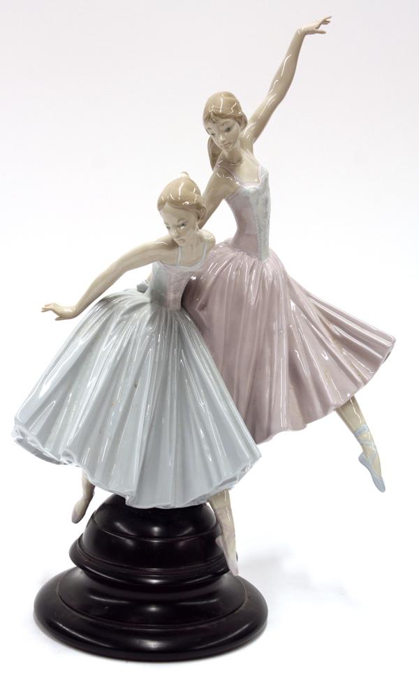 Lladro porcelain figural group number 5035, ''Alegre Ballet'', depicting ballerinas in pose and rising on a graduated circular wood plinth, overall 19''h