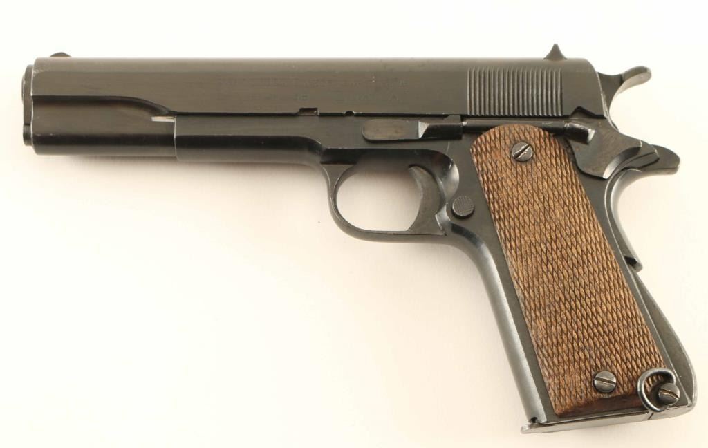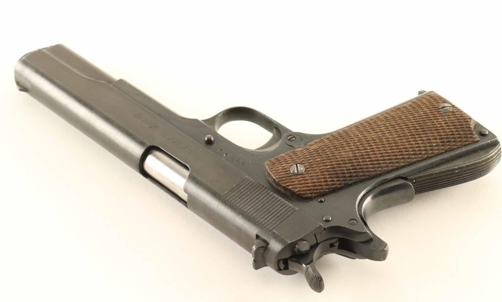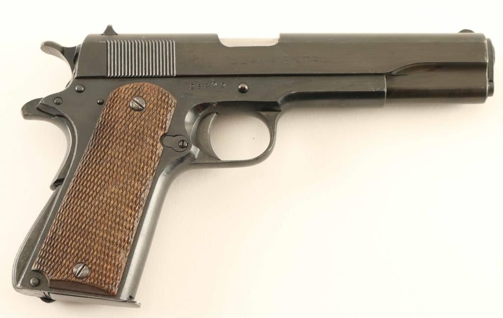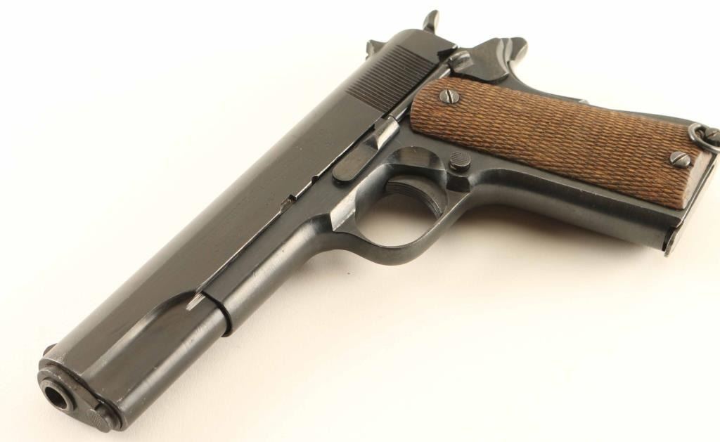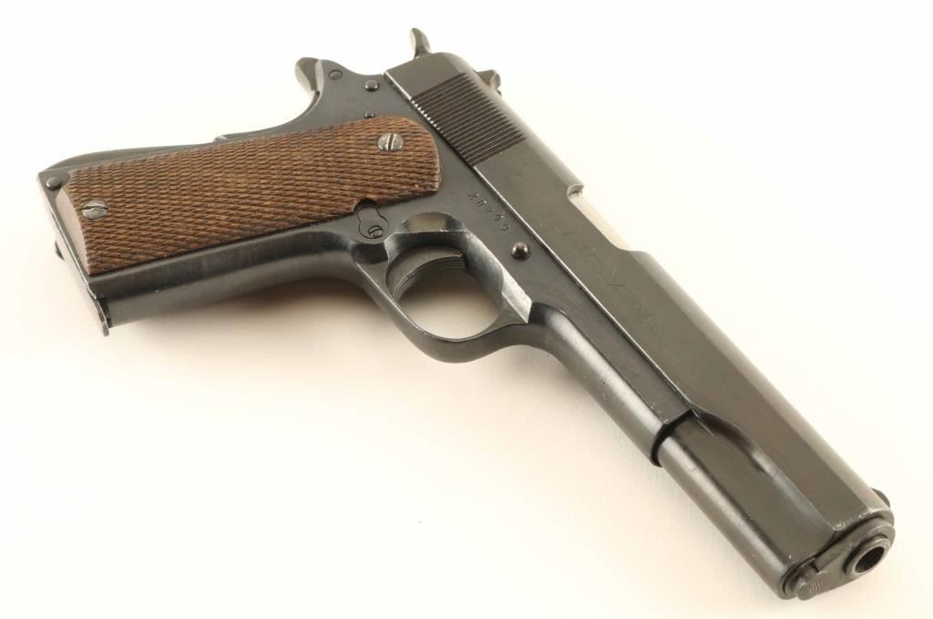 'Gabilondo y Cia' Spanish made single action semi-automatic 1911A1 platform pistol chambered in 9x23mm Largo, manufactured circa 1930's. Features a blued refinish, 5 1/2" barrel, low-profile blade front sight, dovetailed rear sight with square notch, serrated trigger, knurled wide hammer spur, manual safety on the left side of the frame, grip safety, push button magazine release, 8 round magazine, serrated arched mainspring housing, lanyard loop and two-piece checkered wood grips. Pistol exhibits approximately 80% of it's blued refinish showing edge wear, thinning and a small amount surface rust/pin prick pitting. Action is sound, the bore is dark with scattered light pitting and the wood grips are good. Condition is NRA Good. ***C&R Firearm***
