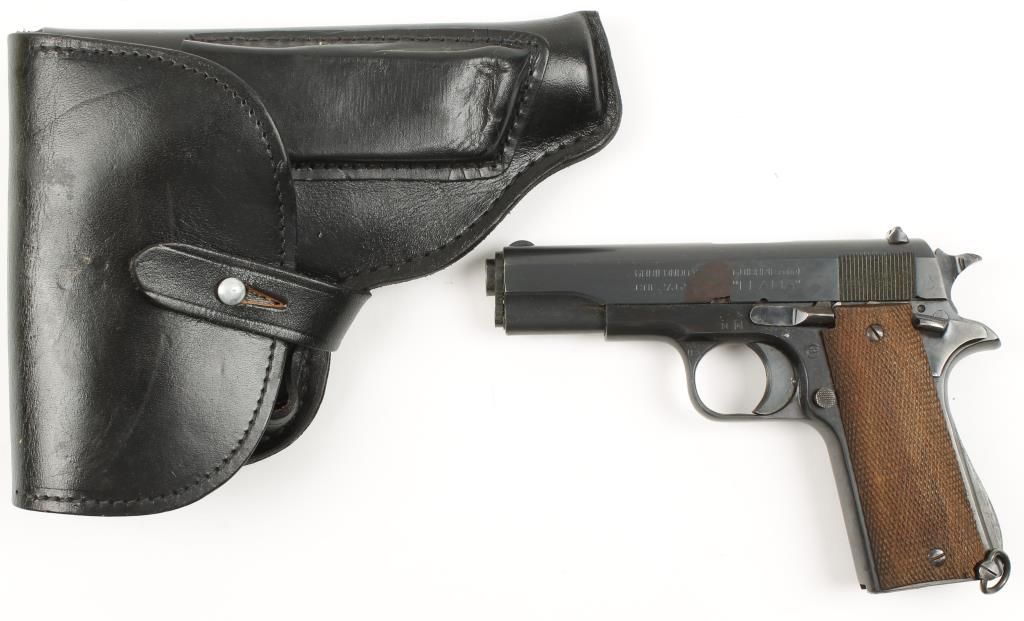 Early model single action semi auto 1911 style pistol with 3-5/8" barrel. Blued finish, checkered wood grips, no grip safety, lanyard ring and fixed sights. Very good bore and action. Includes German style leather holster and 1 magazine which has a small base and is difficult to remove. Condition: Good with odd bluing spot on left side of slide