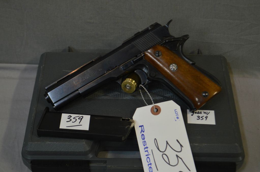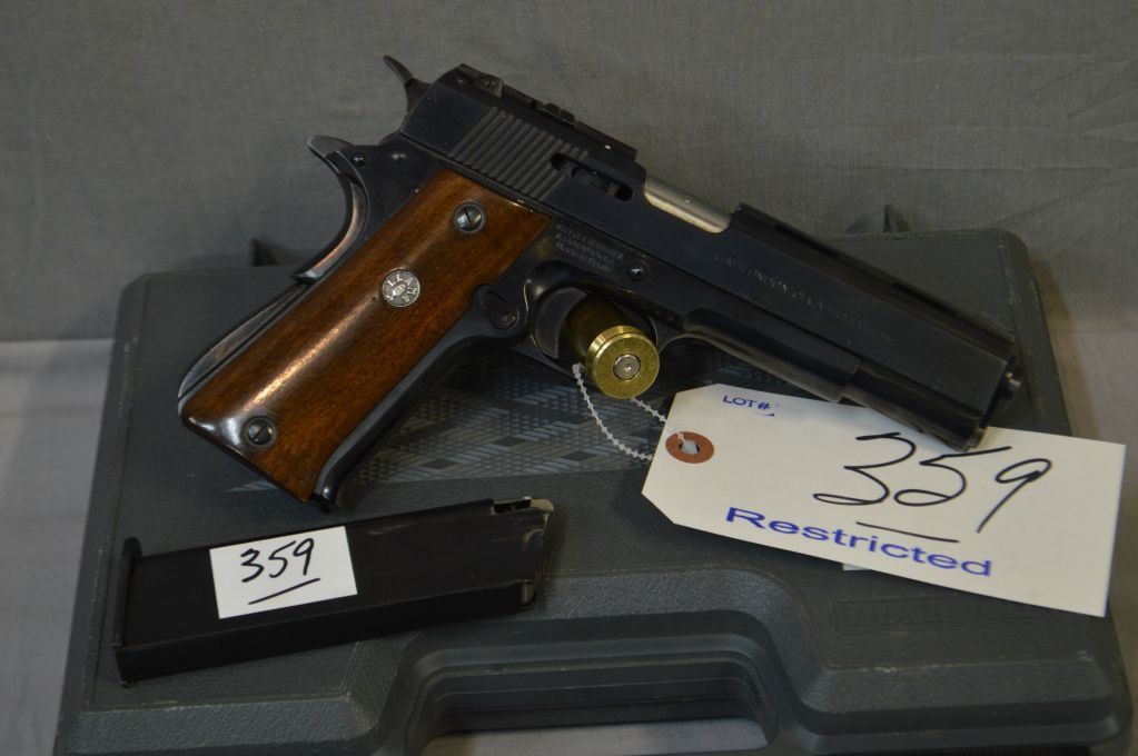 Llama Model IX-A .45 Auto Cal 7 Shot Semi Auto Pistol w/ 127 mm bbl [ blued finish, MISSING PART OF THE BACK SIGHT AND THE EXTRACTOR , vented slide, wooden Llama insignia grips, with extra mag, and foam lined case ] Ser # A04579 Restricted Handgun Cert # 10091869