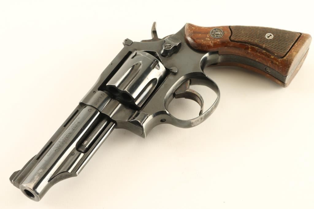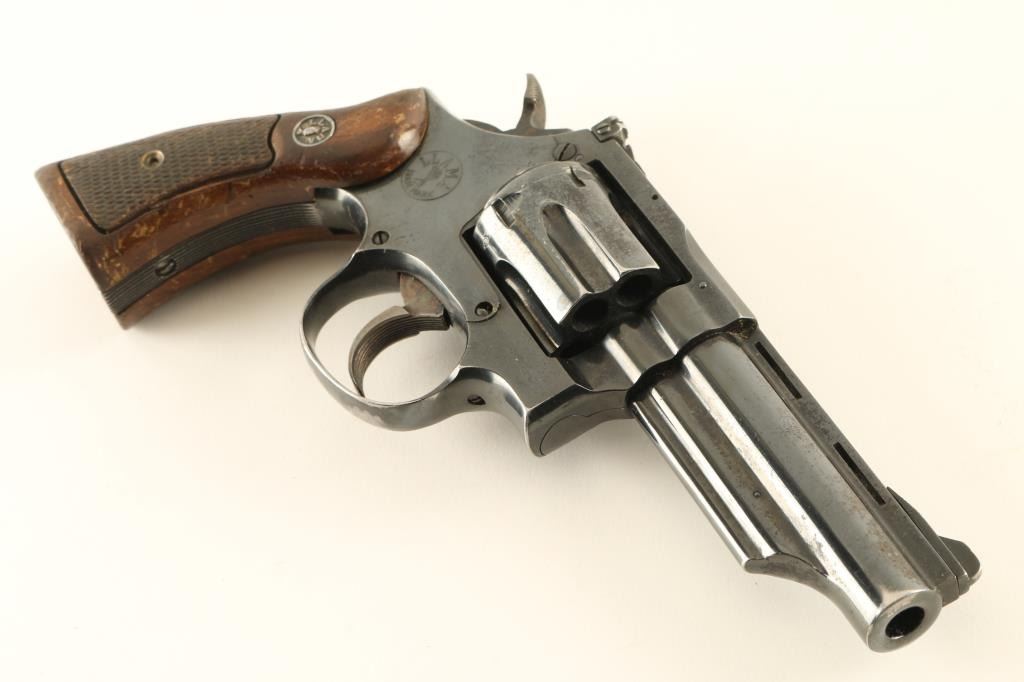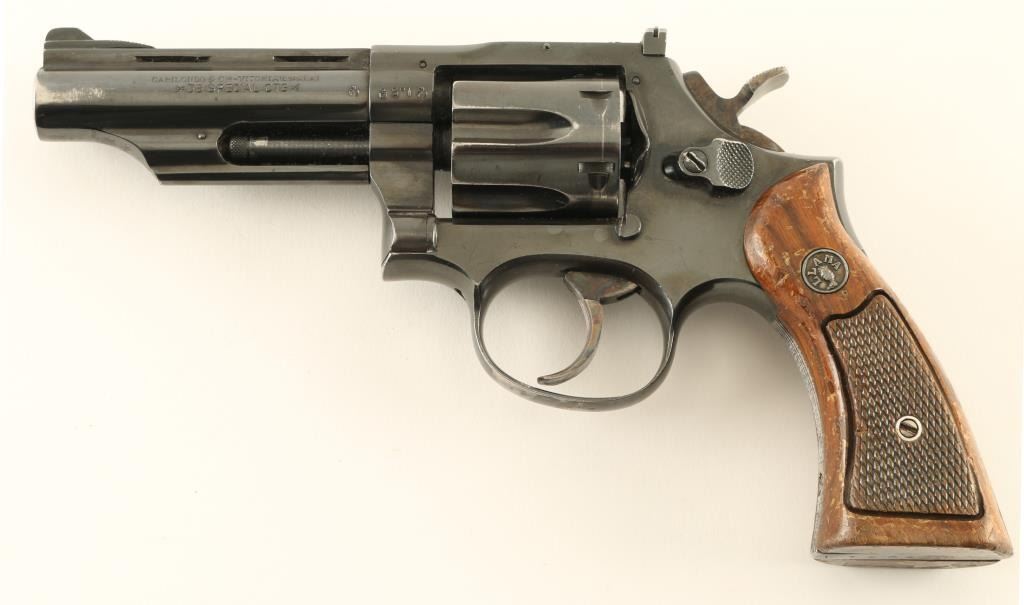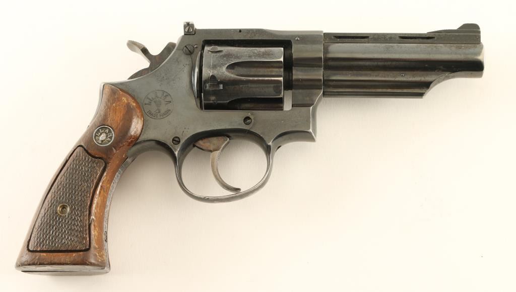 Spanish revolver in 38 Special. Barrel is marked "Gabilando & Cia - Vitoria (Espana)" Features adjustable sights, single or double action, six shot cylinder, and an approx. 4 inch barrel, Bore is excellent. Metal finish is a polished dark bluing in very good condition with bare metal visible around muzzle, front edge of cylinder, and several places near cylinder locking notches. Trigger and hammer retain much original case color. Checkered wood grips bearing the Llama logo are in good condition with numerous small dings and peeling varnish. Action function smoothly and lock up is tight. Forward sideplate screw has broken head, located in hole. Condition is NRA Very Good ***Modern Firearm***