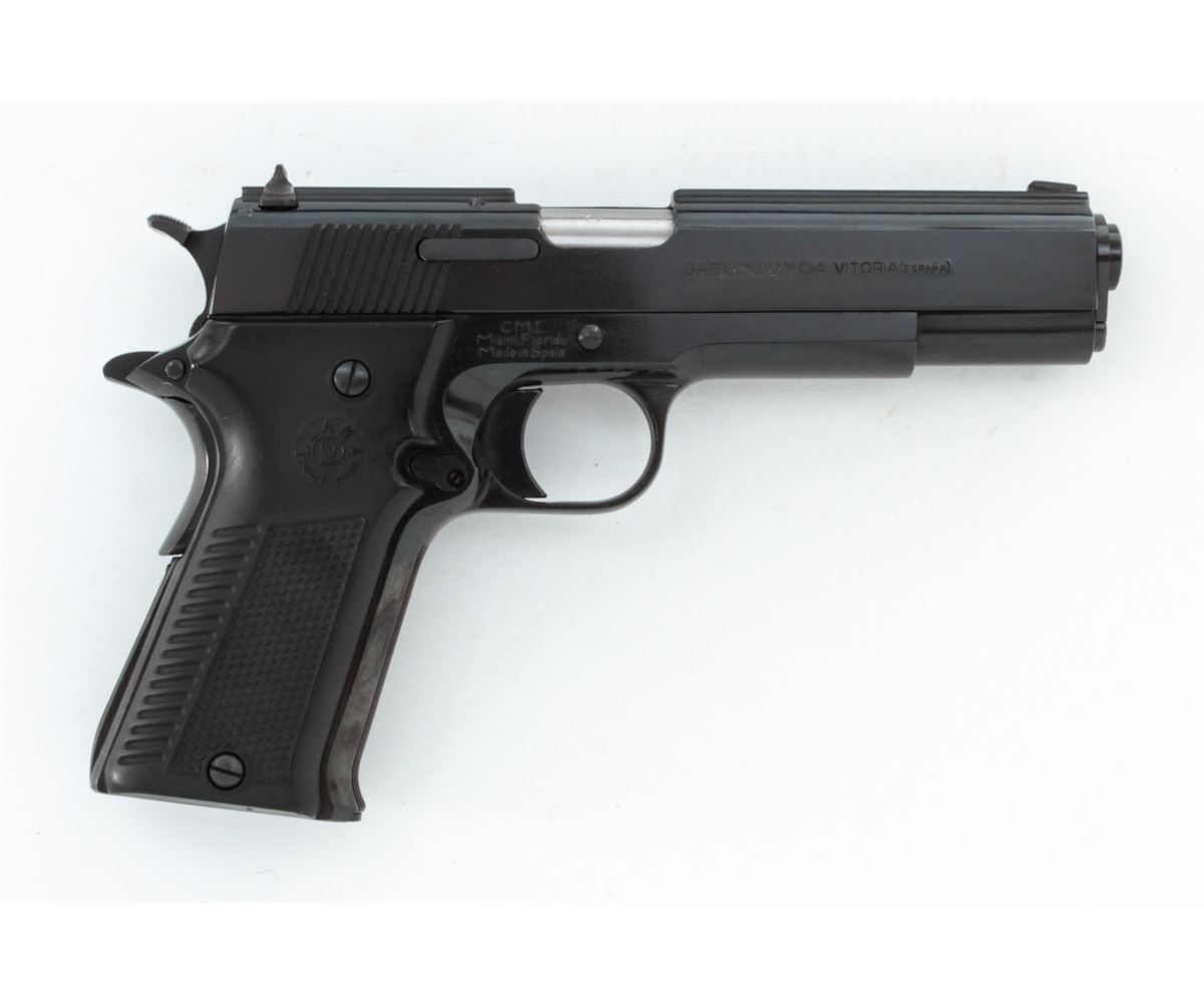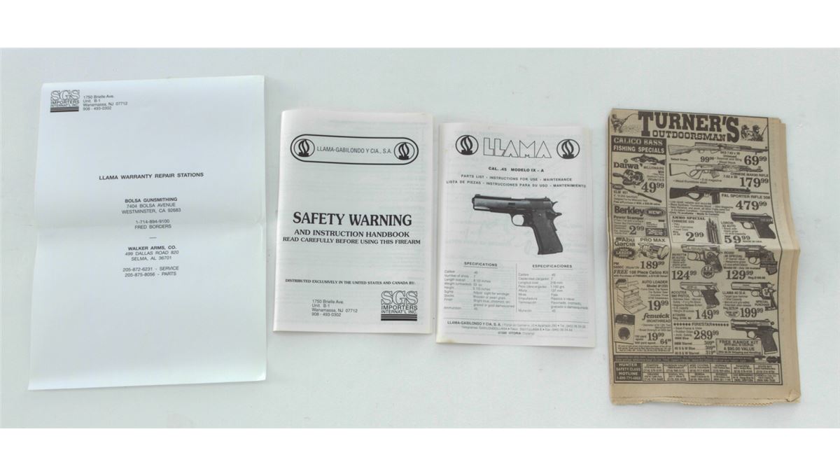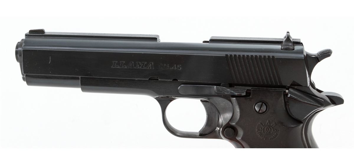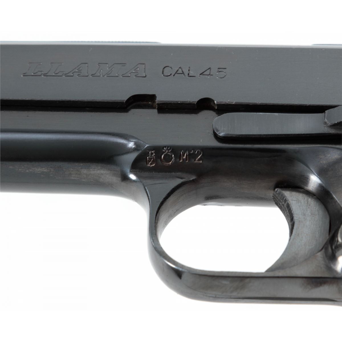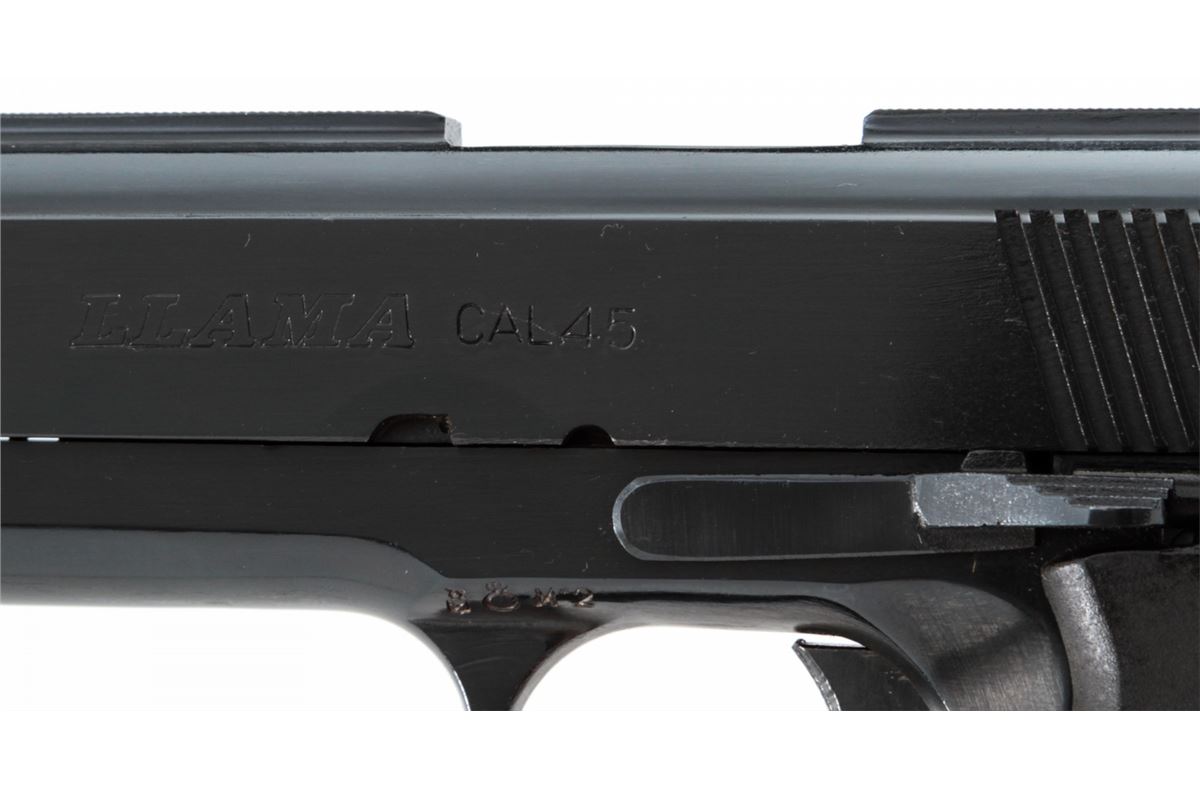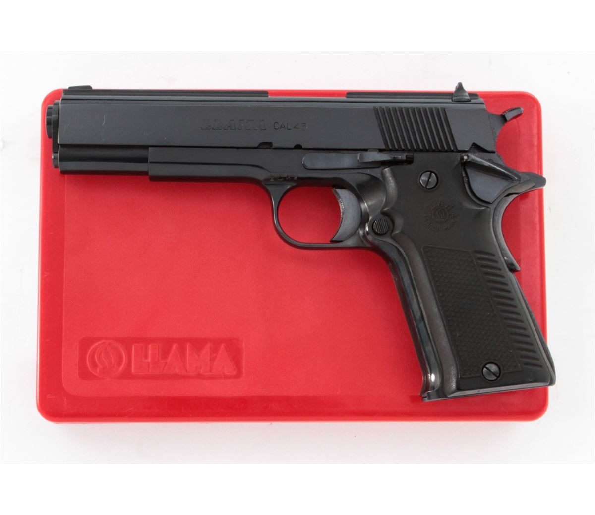 Llama Semi-Automatic Pistol, #CO9424, .45 cal., 5'' barrel, blue finish, factory checkered black plastic grips. Condition is excellent with light marks from handling and moderate scratches to left side of frame, in original box. Est.: $250-$450. (Modern/PPT)