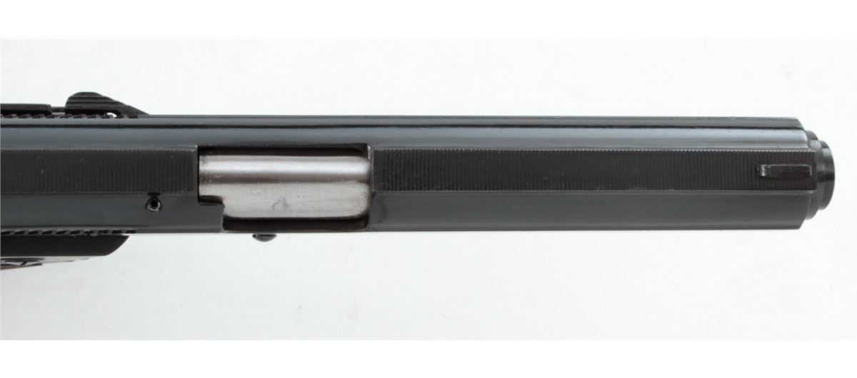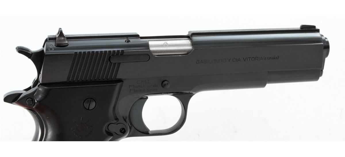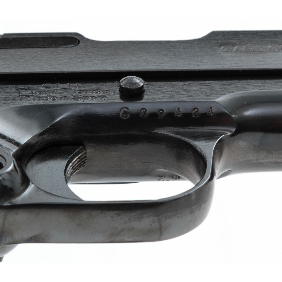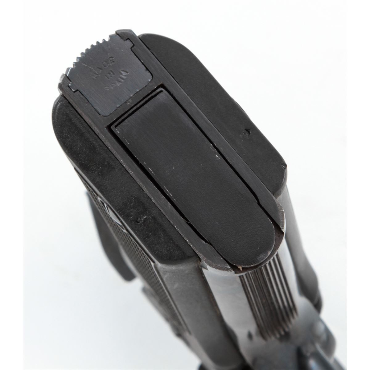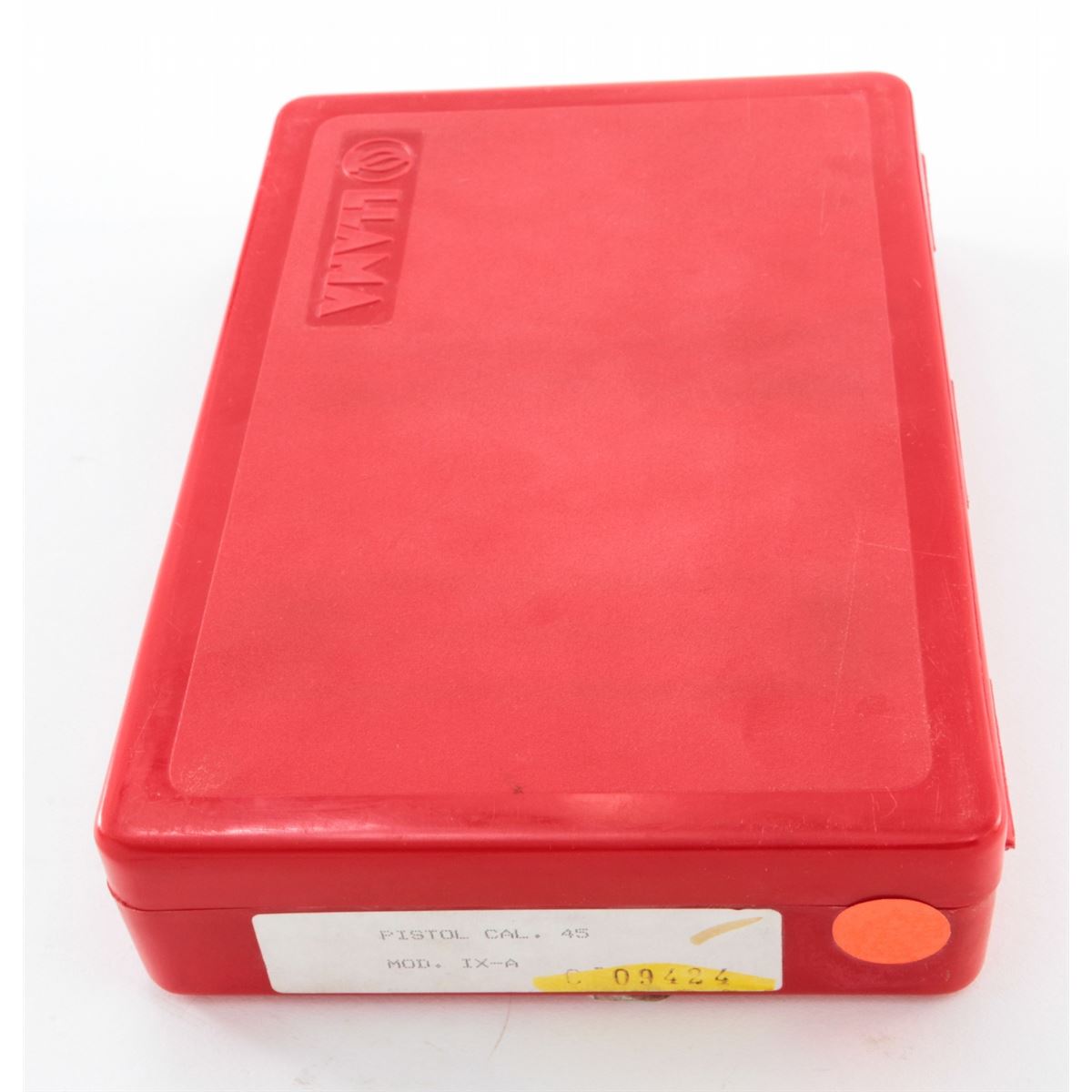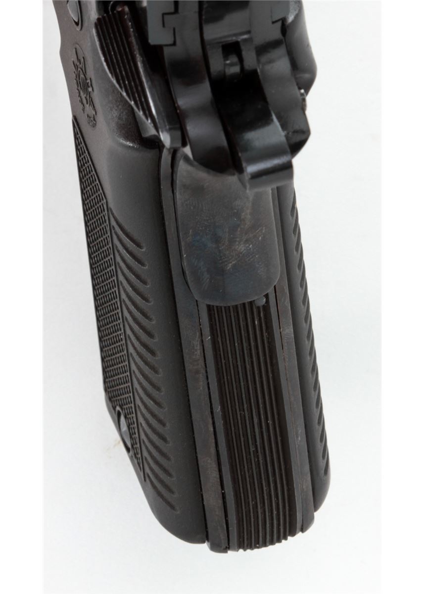 Llama Semi-Automatic Pistol, #CO9424, .45 cal., 5'' barrel, blue finish, factory checkered black plastic grips. Condition is excellent with light marks from handling and moderate scratches to left side of frame, in original box. Est.: $250-$450. (Modern/PPT)