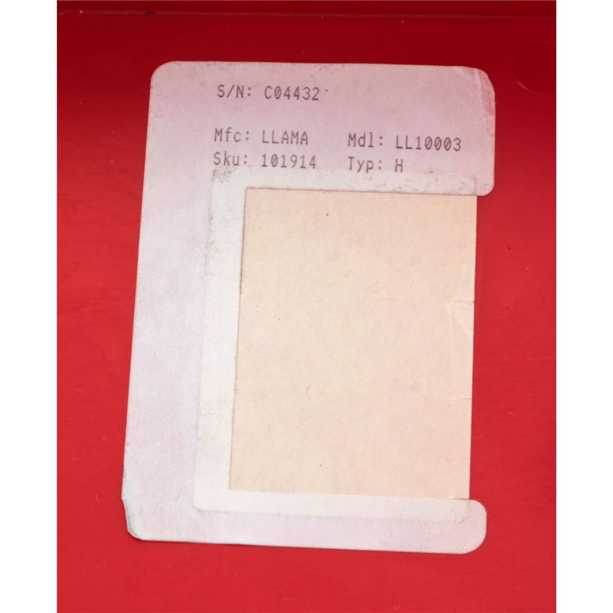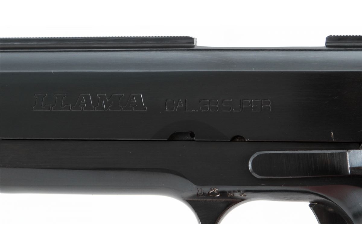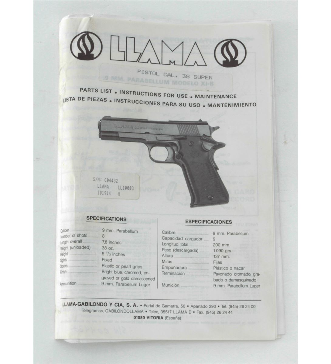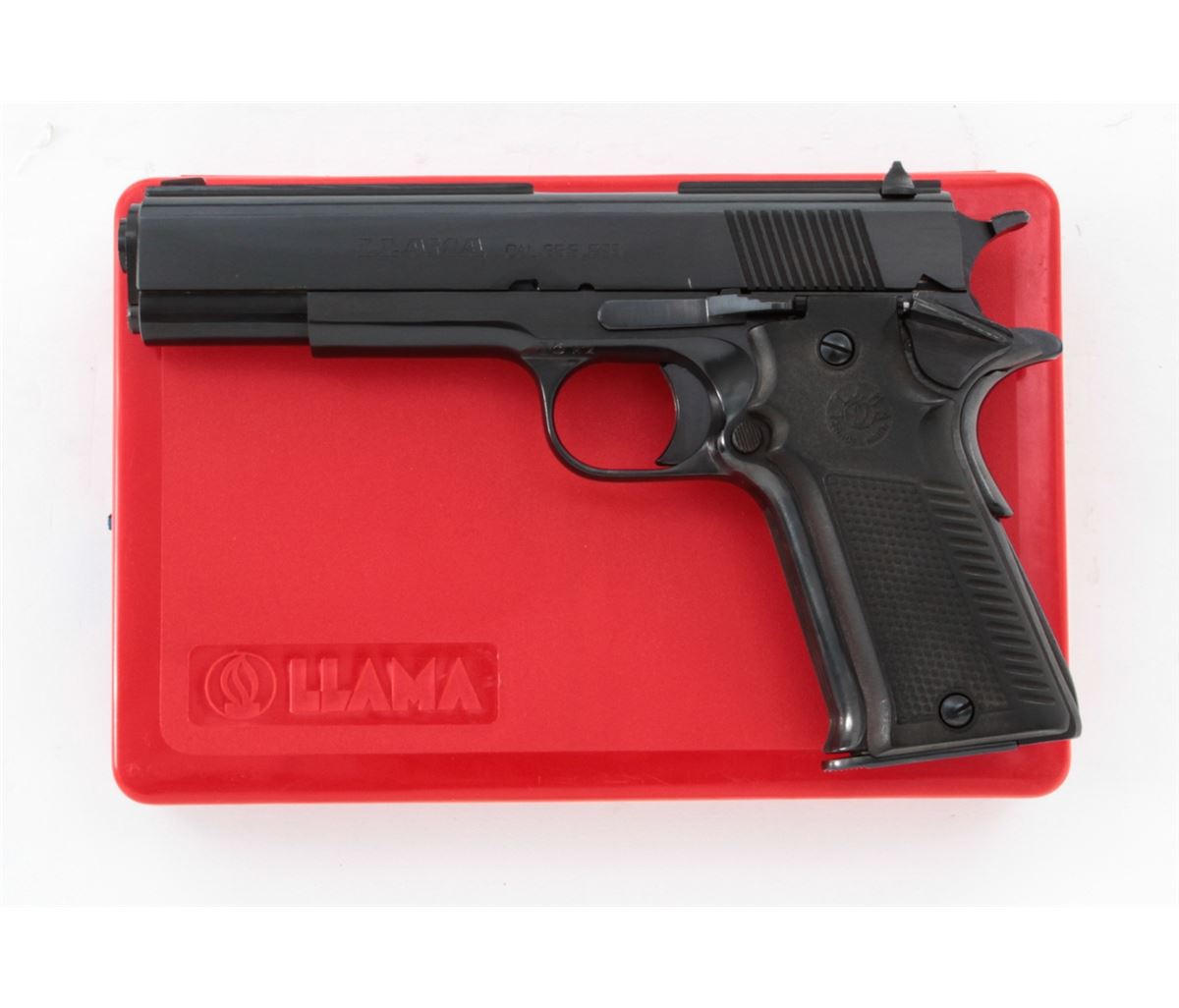 Llama Semi-Automatic Pistol, #CO4432, .38 Super cal., 5'' barrel, blue finish, factory checkered black plastic grips. Condition is excellent with light marks from handling. Grips show mild discoloration. In original box. Est.: $250-$450. (Modern/PPT)