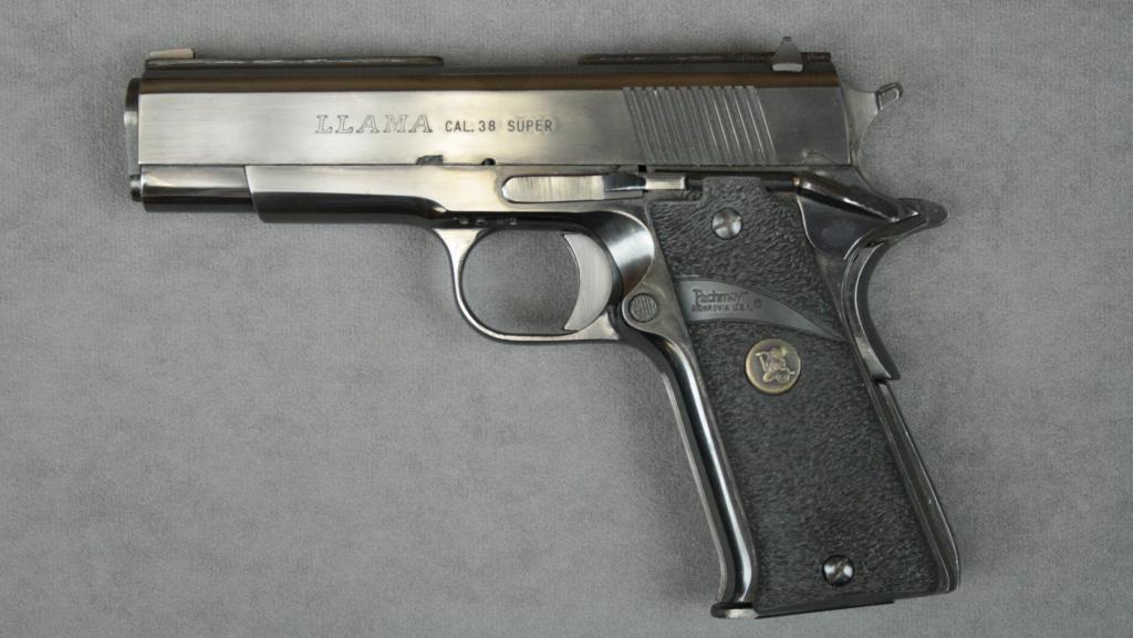 Llama semi-auto pistol, .38 Super cal., 4-1/4” barrel, black finish, Pachmayr Sure Grip hard rubber combat grips, #C17036. This gun is in overall excellent condition showing approx. 99% original finish, fine bore,action, markings and grips; accompanied by an Uncle Mike woven belt holster. Est.: $250-$500.