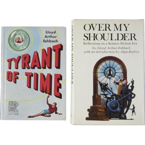 <B>Lloyd Arthur Eshbach. Two First Editions, One Signed</B></I>, including: <B><I>Tyrant of Time</B></I></B></I>. Reading, Pennsylvania: Fantasy Press, Inc., [1955]. First edition. One of 500 numbered and signed limited editions inscribed by the author on the limitation page to famous science fiction writer, editor, and fanzine creator Lee Hoffman. Twelvemo. 253 pages. Publisher's red cloth with gilt spine titles. In original pictorial dust jacket designed by Ric Binkley. Boards show minor shelf wear. Textblock toned around the edges. Moderate corner and spine end wear to the dust jacket, else fine. [and:] <B><I>Over My Shoulder</B></I></B></I><I>. Reflections on a Science Fiction Era</B></I>. Introduction by Algis Budrys. Philadelphia: Oswald Train Publisher, 1983. First edition. Octavo. 417 pages. Publisher's blue cloth with gilt spine titles. In original pictorial dust jacket (original price clipped, later price stamped on front flap). Book is excellent, with minimal bottom edge wear. Minor wear at the spine ends of the dust jacket, else a fine copy. <I>From the Robert and Diane Yaspan Collection.</B></I><BR><BR><b>Shipping:</b> Books & Catalogs (<a target="_blank" href="http://www.heritageauctions.com/common/shipping.php">view shipping information</a>)
