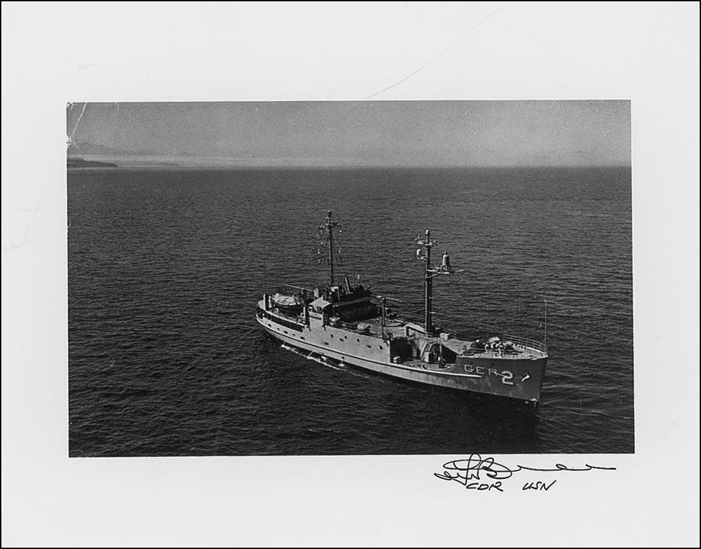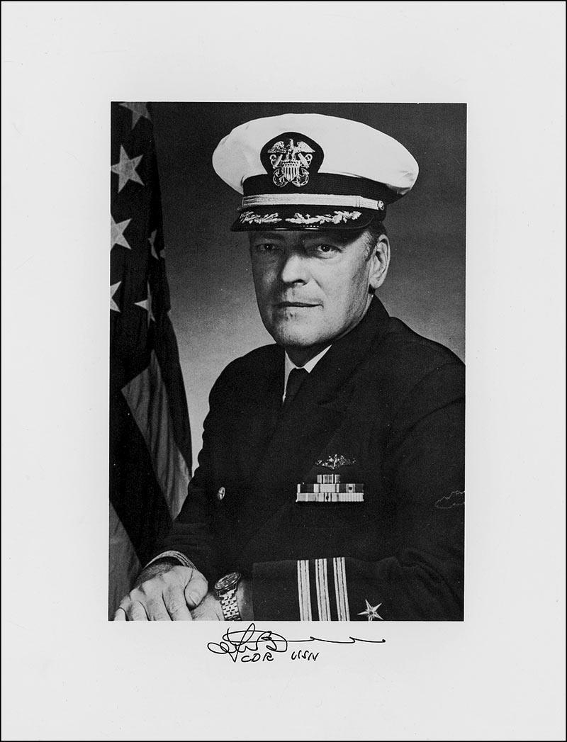 Commander of the spy ship USS Pueblo (1927–2004). Two items: satin-finish 8 x 10 photos of Bucher in uniform, signed in black felt tip “Lloyd Bucher, CDR, USN”; and a satin-finish 10 x 8 of the Pueblo at sea, identically signed. In fine condition, with corner bends.