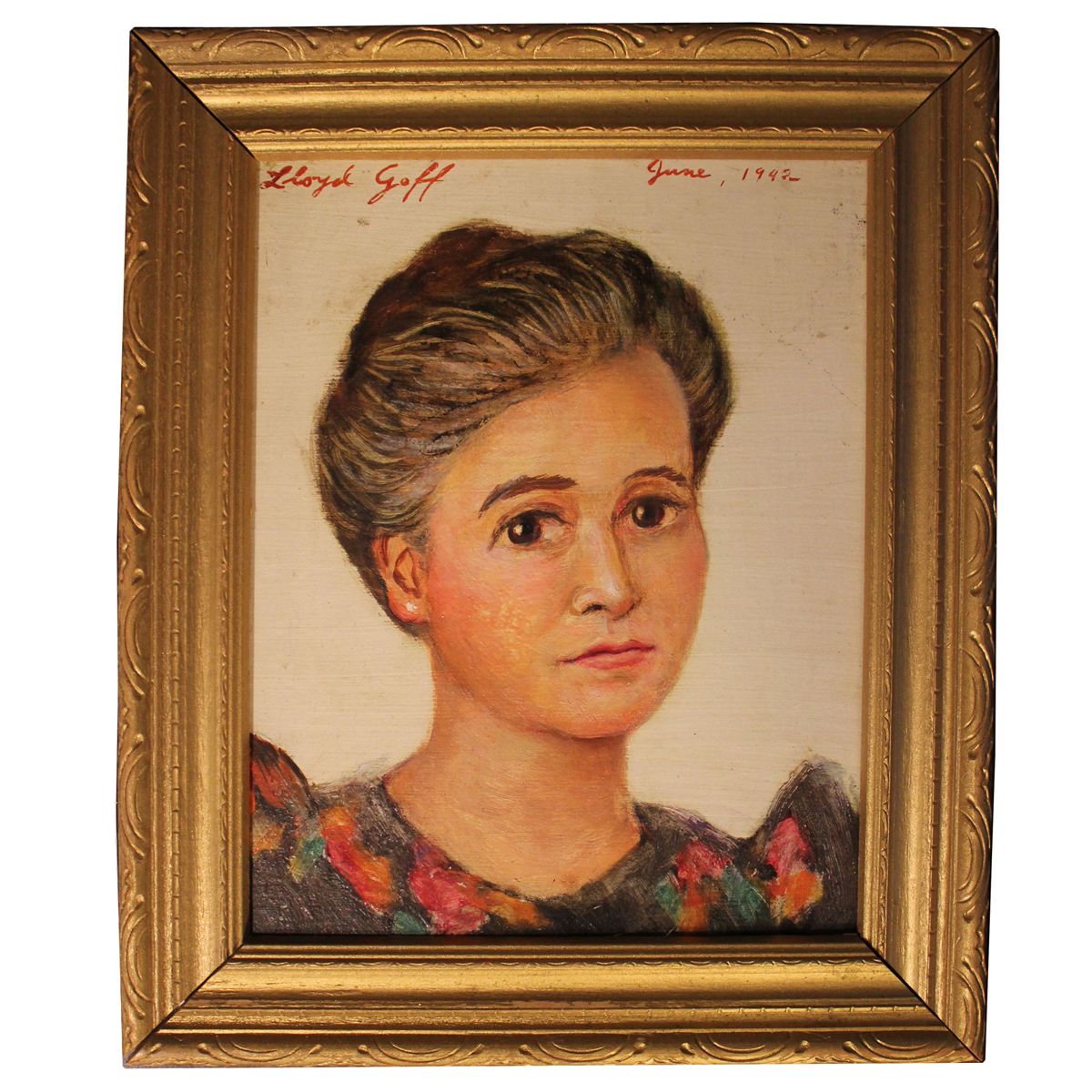Oil on board portrait by American artist Lloyd Lozes Goff, signed and dated June 1942 across the top by the artist. Goff, a Texas-born artist, painted the landscapes and portraits of the southwest; his work resides in the Whitney Museum, the Museum of Modern Art and the Dallas Museum of Fine Arts. This portrait, believed to be of Goff's wife, measures 7.5'' x 9.5'' and is framed to 10'' x 12'' in a gilt wood frame. Near fine condition.
