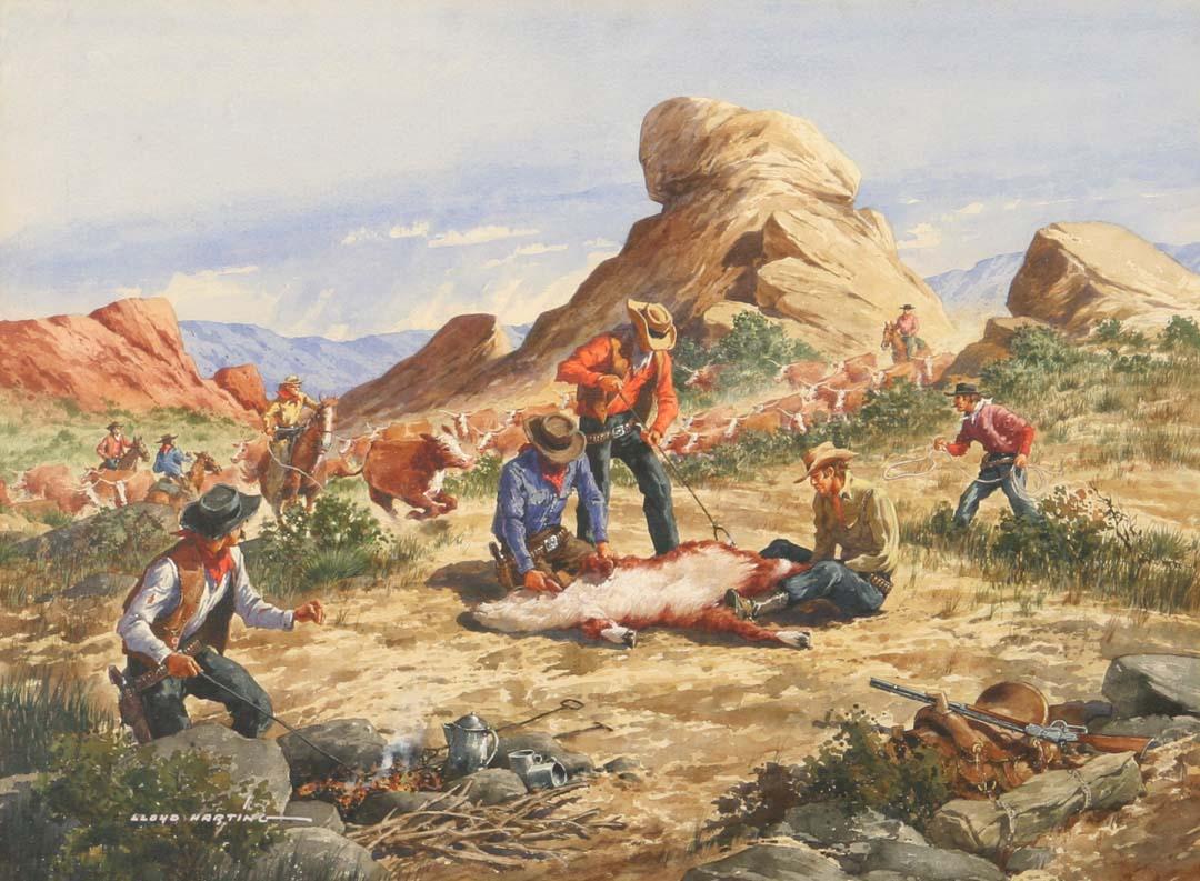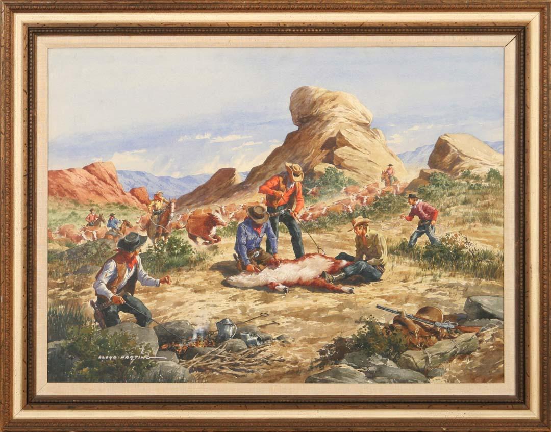 Lloyd Harting (1901-1974). Branding Time. 22" x 30" watercolor. Signed lower left. (est $3,000-$5,000). For condition reports please visit: www.auctioninsantafe.com/cr2011.pdf