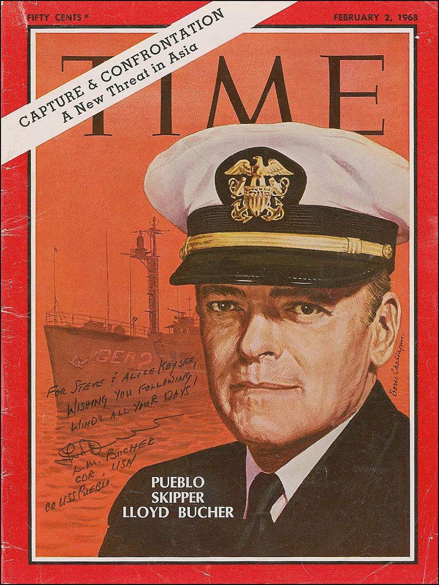 Navy officer (1927–2004) and Captain of the USS Pueblo. Time magazine featuring an artist’s rendition of Bucher on the cover, 8.25 x 11, dated February 2, 1968, signed and inscribed on the front in black felt tip, “For Steve & Alice Keyser, Wishing you following winds all your days!,” adding his signature and printing, “L. M. Bucher, CDR, USN, CO USS Pueblo.” In fine condition, with light creasing and the expected light wear.