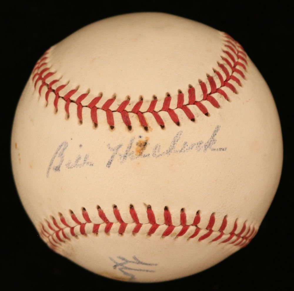 Rawlings Official American League baseball. Hand-signed in blue ink pen by Lloyd Merriman (D. 2004, Red Sox) and Billy Hitchock (D. 2006, Red Sox). Please note, the baseball shows signs of natural toning.