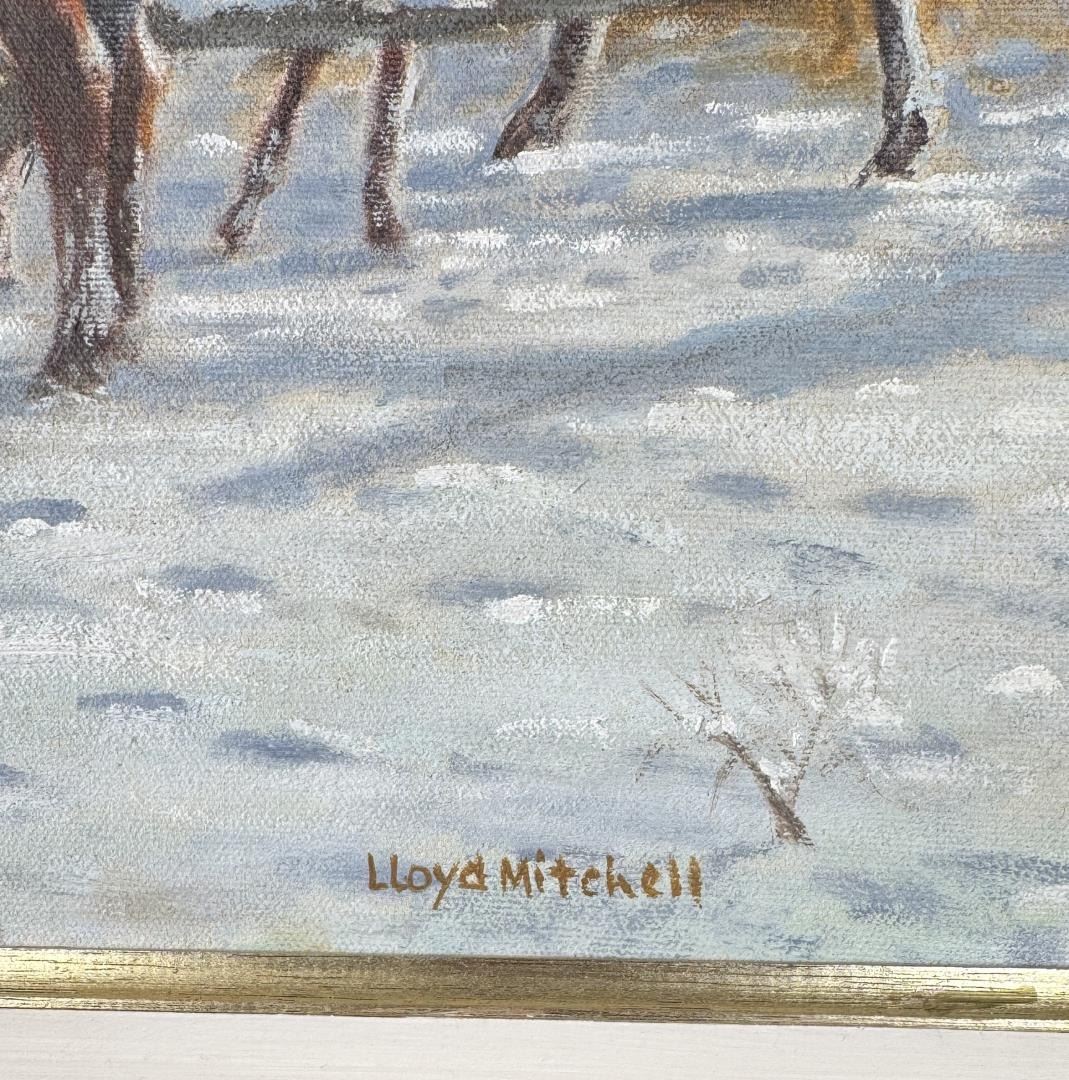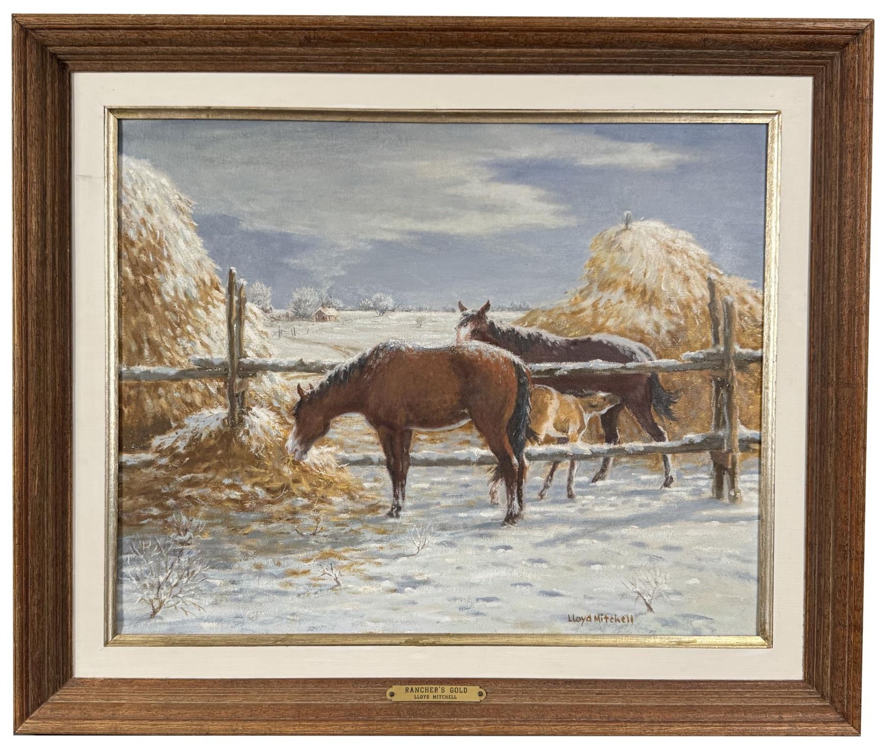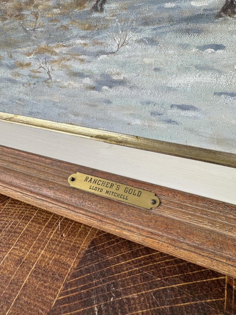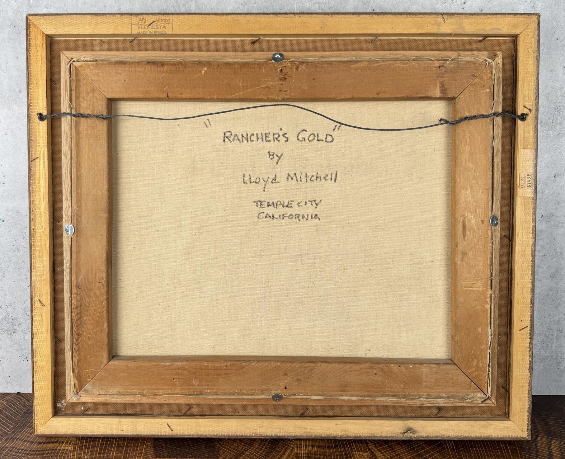 Title is Rancher's Gold. Oil on Canvas. 16" by 20" unframed, 21" by 25" framed. Lloyd Jenning Mitchell (1909 - 1978) was active/lived in California, Arkansas. Lloyd Mitchell is known for Horse, western genre and portrait painting. Lloyd J. Mitchell was born December 21, 1909 in the Ozark Mountains near Van Buren, Arkansas at the edge of Indian Territory. Mitchell's life was a colorful one, with an early love of horses. His father was a horse trader/trainer and Lloyd began riding before he was tall enough to climb onto a horse himself. He used a rope to pull himself up to the saddle. His interest in art began early, too, and, as most boys of his age, he began drawing Indians, horses and cowboys. At the age of 16 he left home to work at ranches in Kansas, Wyoming, Colorado, Texas and Oklahoma. In the early thirties he traveled to California and found work as a movie extra in Westerns featuring Bob Steele, Bill Cody, Tom Mix, Ken Maynard, Iron Eyes Cody (who became a life-long friend) and others. During World War II, he served in the Navy aboard a minesweeper in the Pacific theater. Using the back of maps and charts, he filled an entire scrapbook with sketches and watercolors of battles and shipboard life. It includes a portrait of Henry Fonda, who posed for Mitchell while both were attending Quartermaster school in San Diego. After the war ended, he settled in Temple City, California with this wife, Donna. Although successful in business ventures, he found that painting was always foremost in his mind. In the late 1940's, he studied at the Chouinard Art Institute under noted Western artists, Henry Good and Will Foster. He later studied under Ejnar Hansen, Robert Frame, and Sam Hyde Harris. He was also influenced by his good friend, George Ford Morris. Mitchell was a member of the American Institute of Fine Arts, American Indian and Cowboy Art Society, The Westerners, Southland Art Association and the Los Angeles Corral. His painting "The Country Store" was purchased by Nancy Reagan for her home. Her husband, Ronald Reagan, picked it to hang in his office while he was Governor of California. In the 1970's, Mitchell's "Skinny Saloon" series of paintings became popular and were published as prints and greeting cards by the Leanin' Tree Ranch publishing company of Colorado. They still sell to this day. During his career, his work featuring horses, cowboys, Indians and western landscapes, won numerous cash awards, prizes and honors in prestigious shows. His work was featured in many magazines and news articles. As a noted humorist, he was a popular speaker and was in great demand as a judge and painting demonstrator. His work was represented in art galleries throughout southern California. Lloyd J. Mitchell passed away in July of 1978, in Sun City, California.