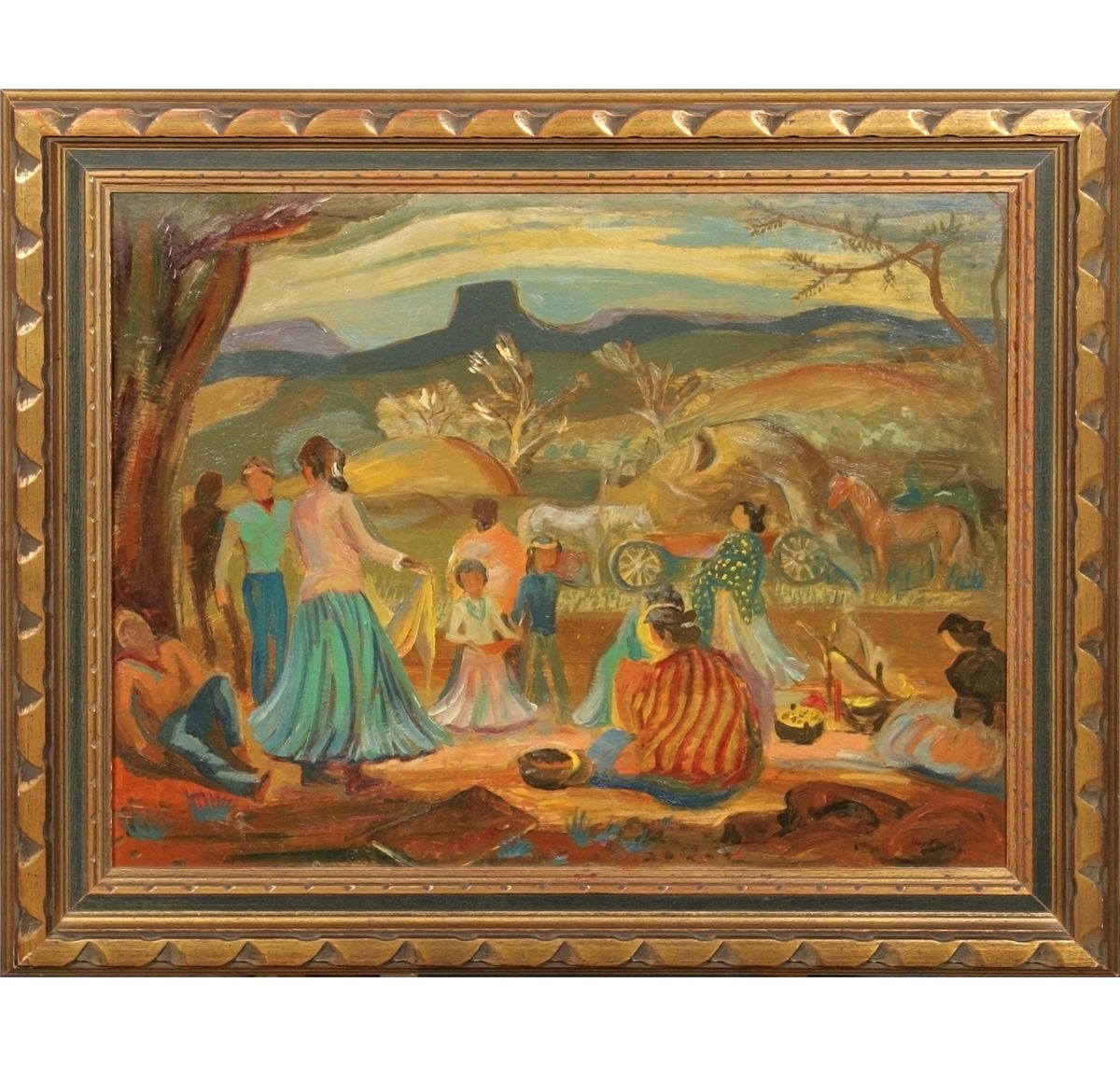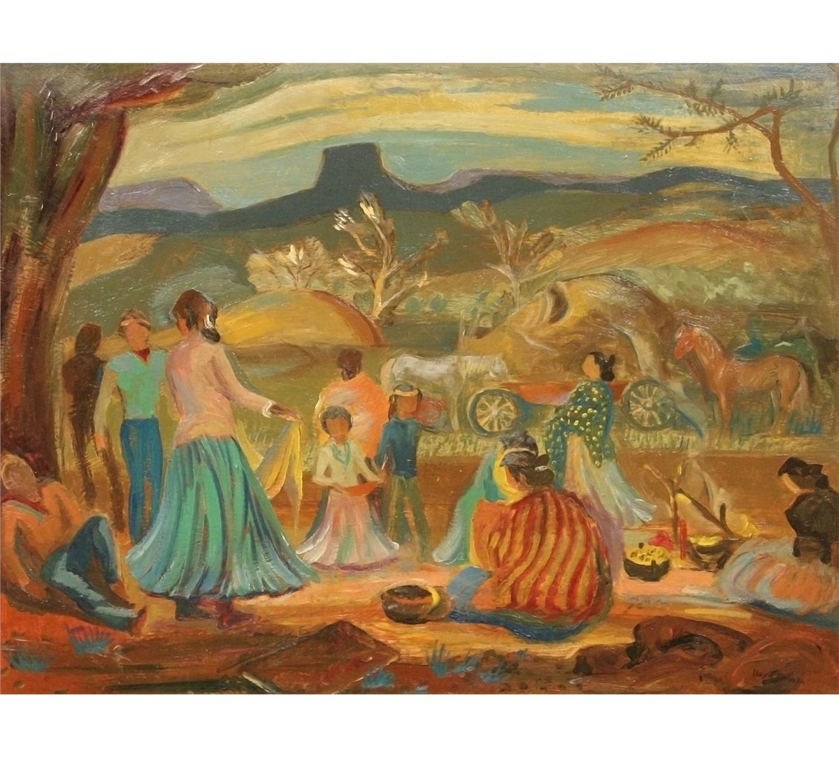 Lloyd Moylan (1893 - 1963). Cookout. 22" x 27.5" oil on board. Signed lower right: lloyd moylan.