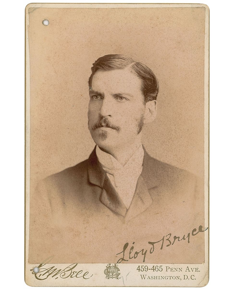 Congressman from New York and editor of the North American Review (1851–1917). Original 4.25 x 6.5 cabinet photo by C. M. Bell of Washington, signed at the bottom of the image in black ink, “Lloyd Bryce.” In very good condition, with scattered foxing and spotting to the image, corner tip creasing, and two punch holes to the left border.