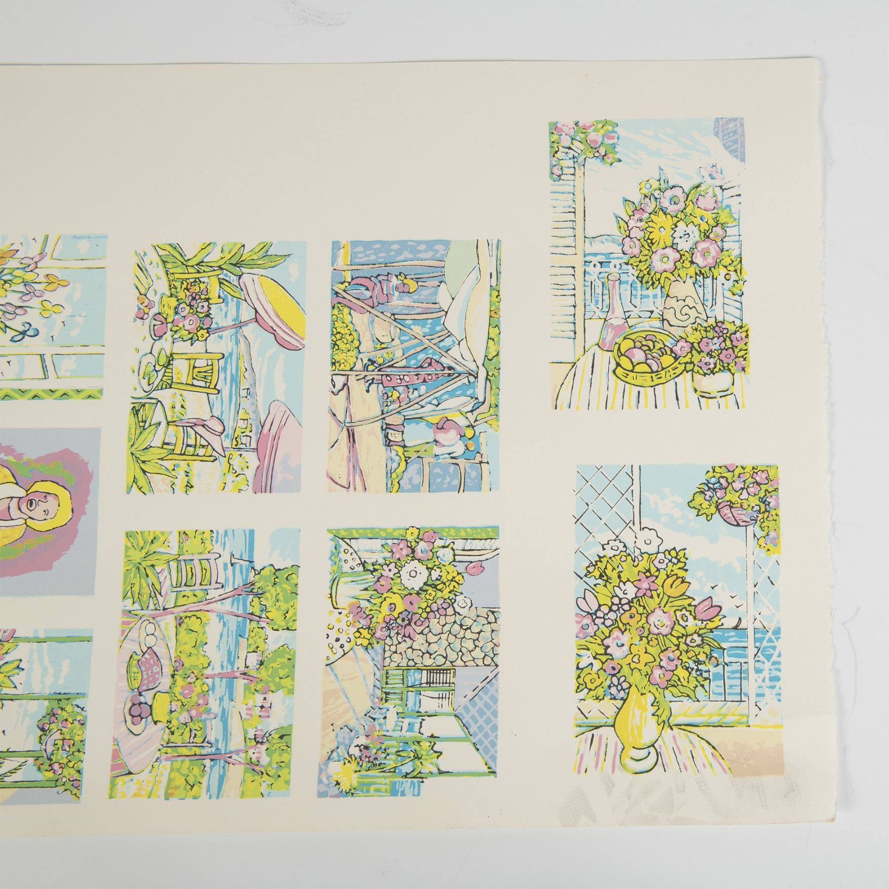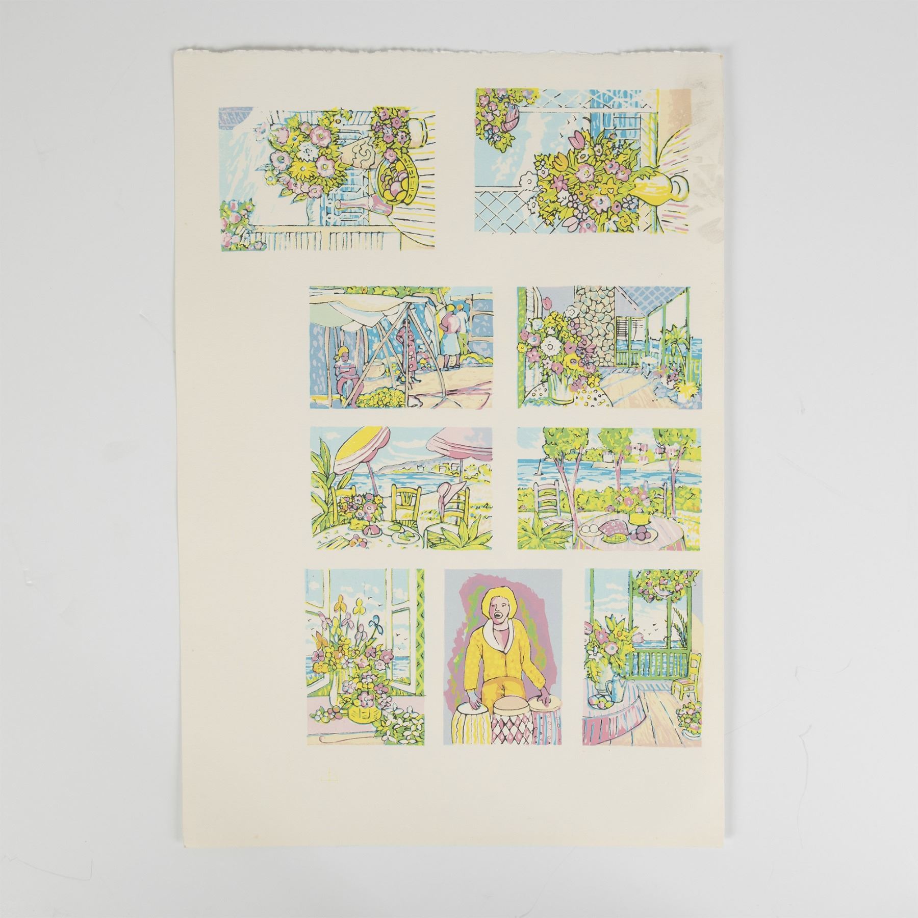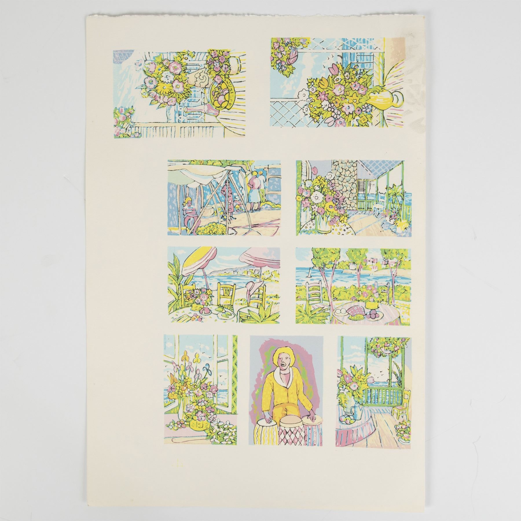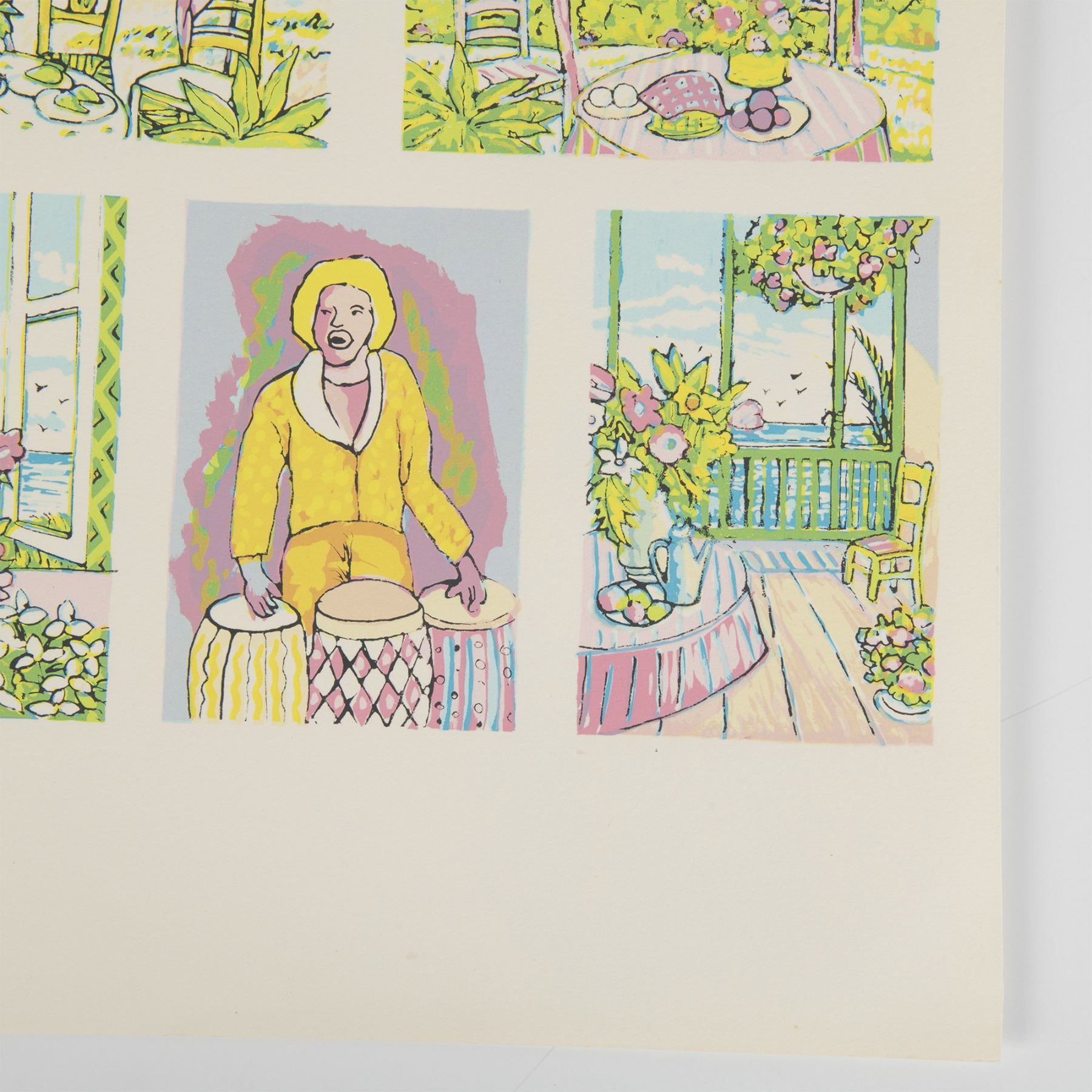 An original serigraph in colors on paper by Jamaican artist Lloyd Van Pitterson, depicting nine miniature scenes on one sheet. Yellow symbol marking on lower left side.
