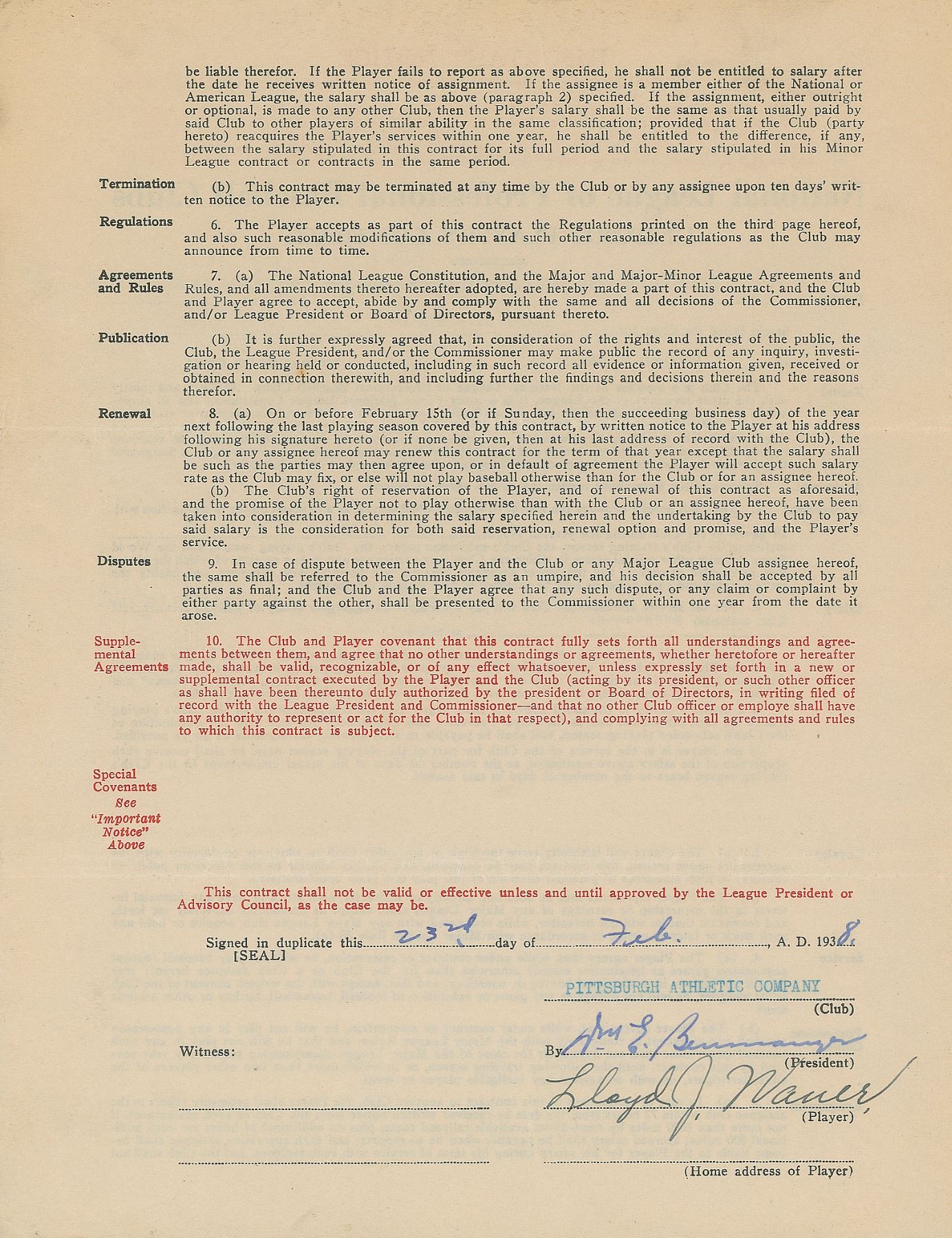 Contract, signed “Lloyd J. Waner,” four pages on two adjoining sheets, 8.5 x 11, February 23, 1938. National League uniform player's contract in which Lloyd Waner agrees to render "skilled service as a baseball player in connection with all games of the Club during the year 1938" for the Pittsburgh Pirates, for a salary of $11,000. Signed at the conclusion in fountain pen by Waner, and countersigned by Pirates Owner Bill Benswanger. The reverse is signed by National League President Ford Frick. In fine condition, with consistent overall toning and slight edgewear.