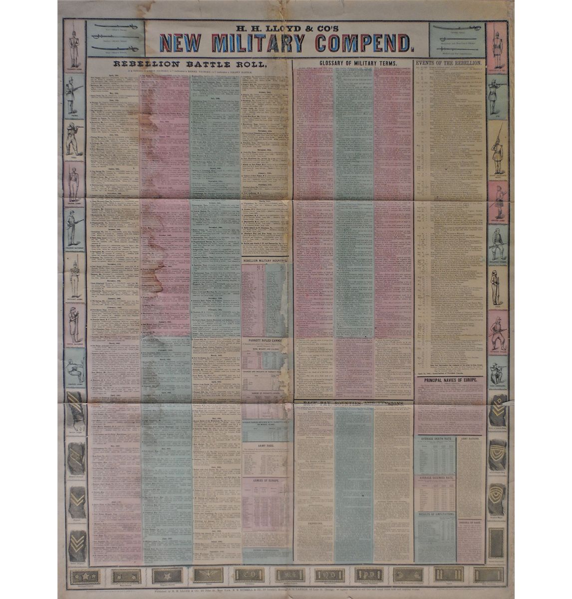 Huge and fascinating original 1865 color broadside titled at the top, H. H. Lloyd & Co’s New Military Compendium printed by H. H. Lloyd & Co. of New York and partners and measuring approximately 32 x 42. This great all comprehensive display gives an amazing amount of informative facts that list a Rebellion Battle Roll (also indicating which side won the respective battle), Events of the Rebellion, Glossary of Military Terms, Rebellion Military Hospitals, Back Pay, Bounties and Pensions, Army Food and Rations, Parrott Rifled Cannon Ranges, Rebel Surrenders, Average Death Rate, Sickness Rate, Results of Amputations, and more, with illustrations of Officers' shoulder straps and enlisted men's chevron ranks, edged weapons, and soldiers demonstrating the School of the Soldier as a border. Broadside bas been linen backed. In good condition, with small separations along previous storage folds, edge tears, several areas of paper loss (mainly along central vertical fold), and areas of moderate dampstaining.
