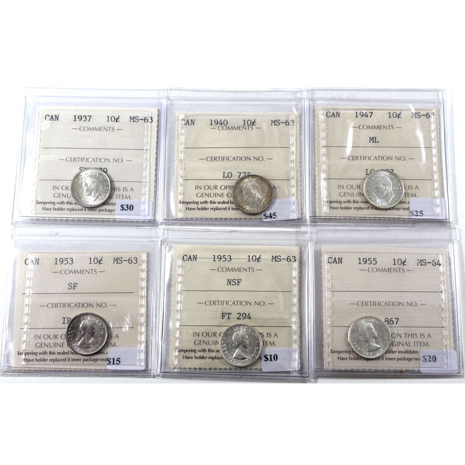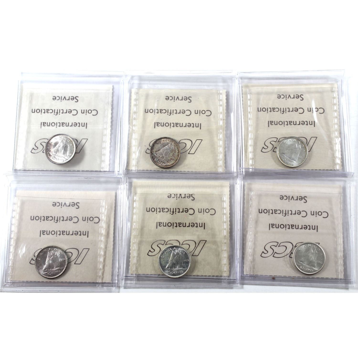 Lo of Canada 10-cents ICCS MS-63: 1937, 1940, 1947 ML, 1953 SF, 1953 NSF, & 1955 MS-64. 6pcs