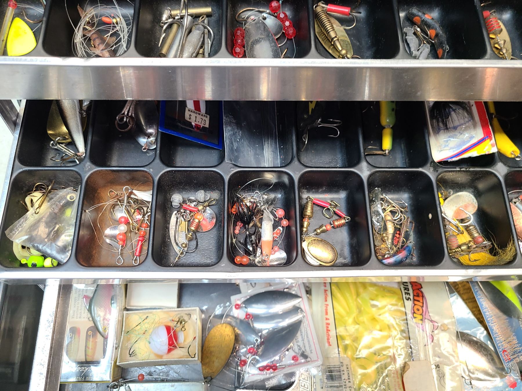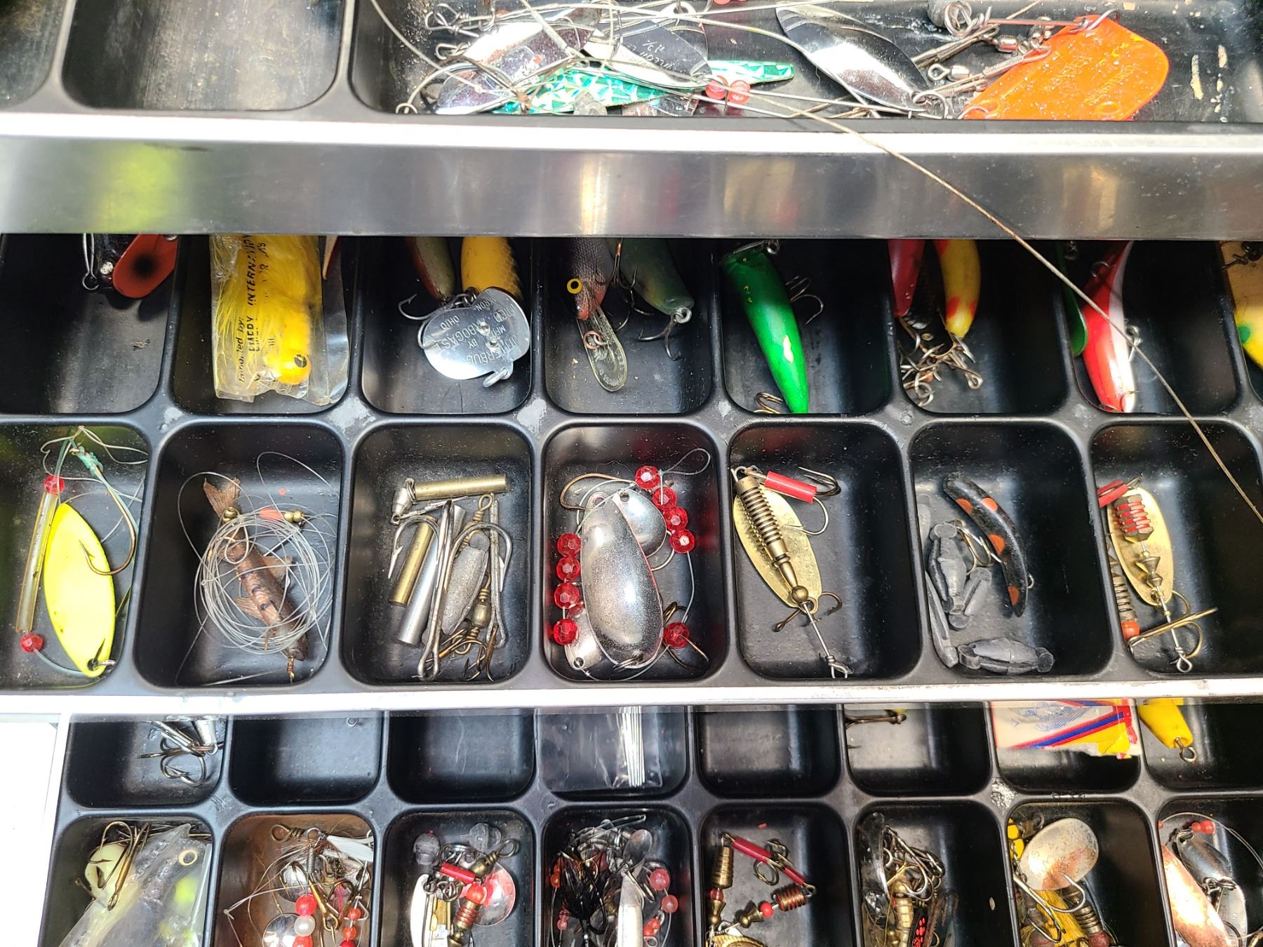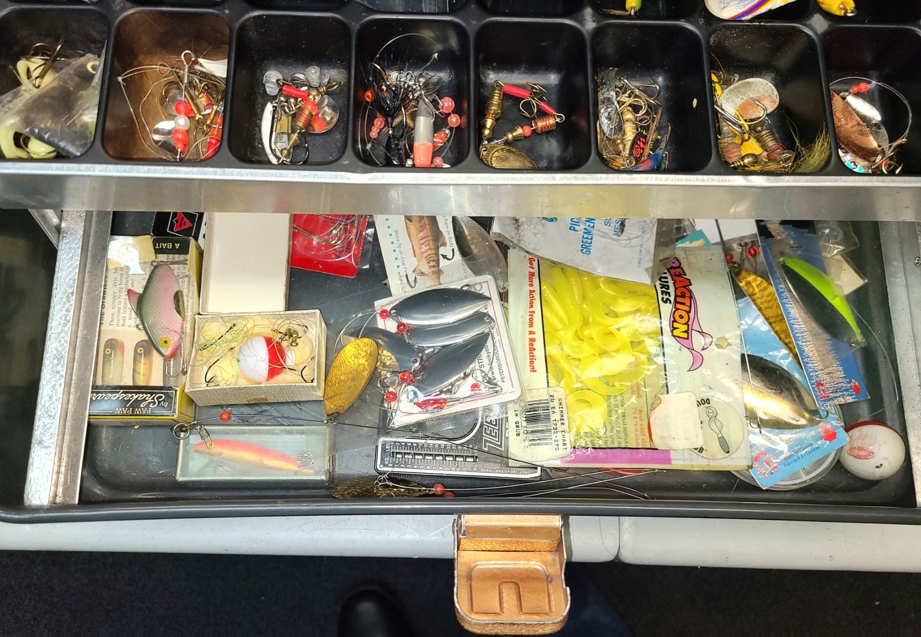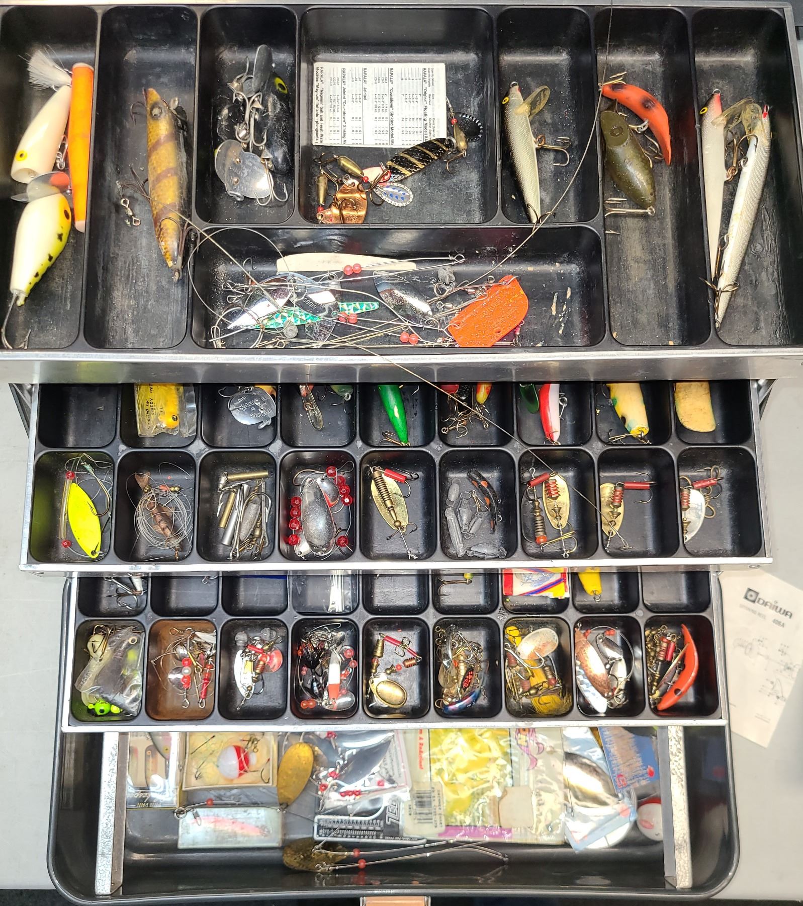 Loaded Fishing Tackle Box - Various Items in 3 tier USA Made Metal Box