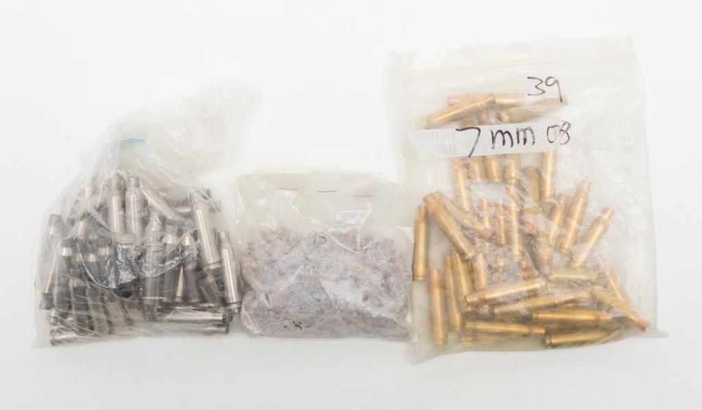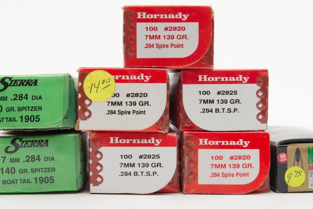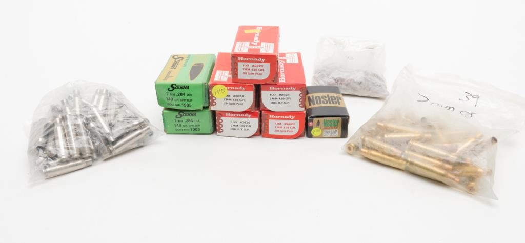 Loaders lot of 7mm bullets and brass. The lot consists of approximately 500+ bullets by various manufacturers including Hornady, Nosler and Sierra in 7mm. Additionally, the lot contains 89 pieces of fired 7mm/08 brass with various head stamps.$50-$100.