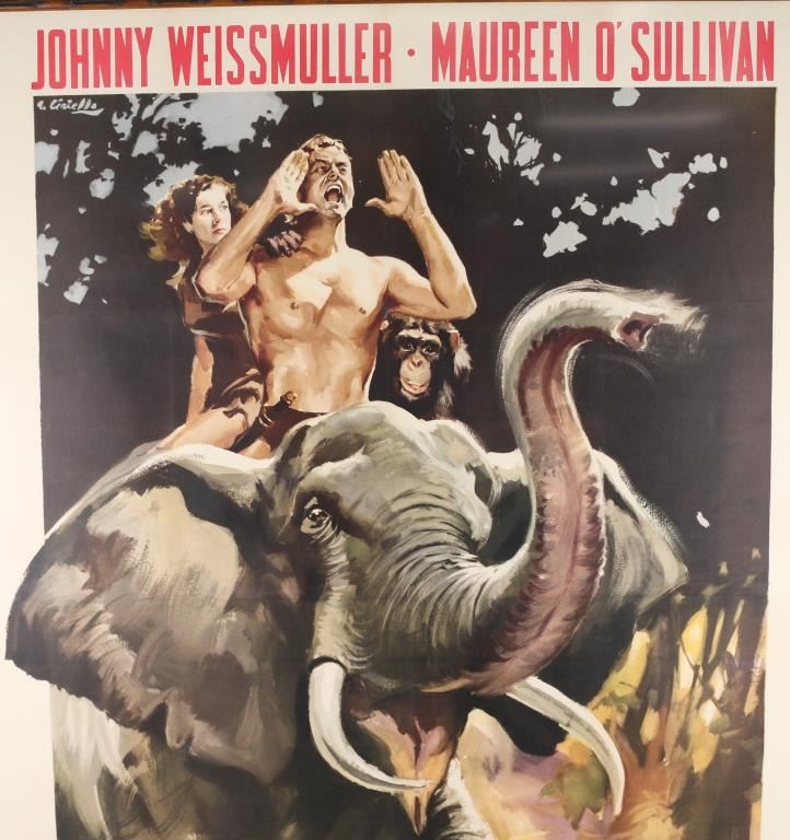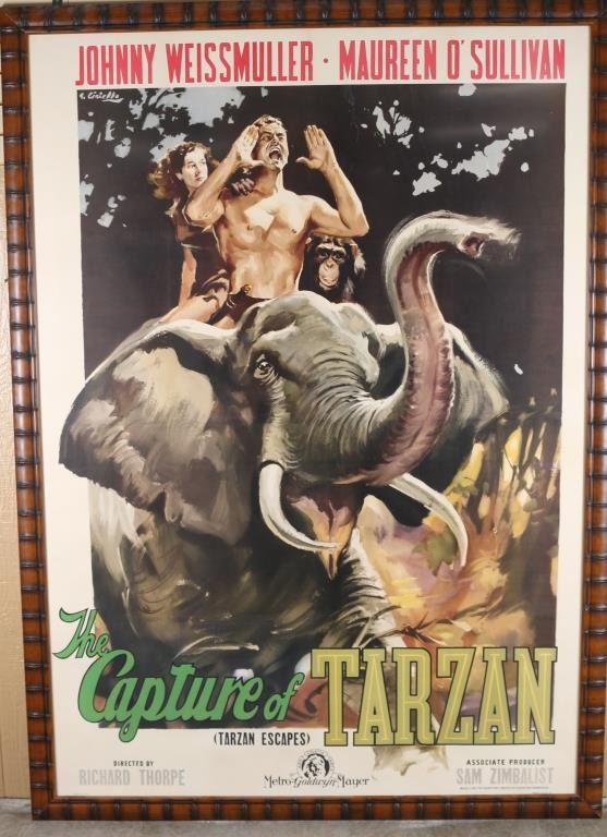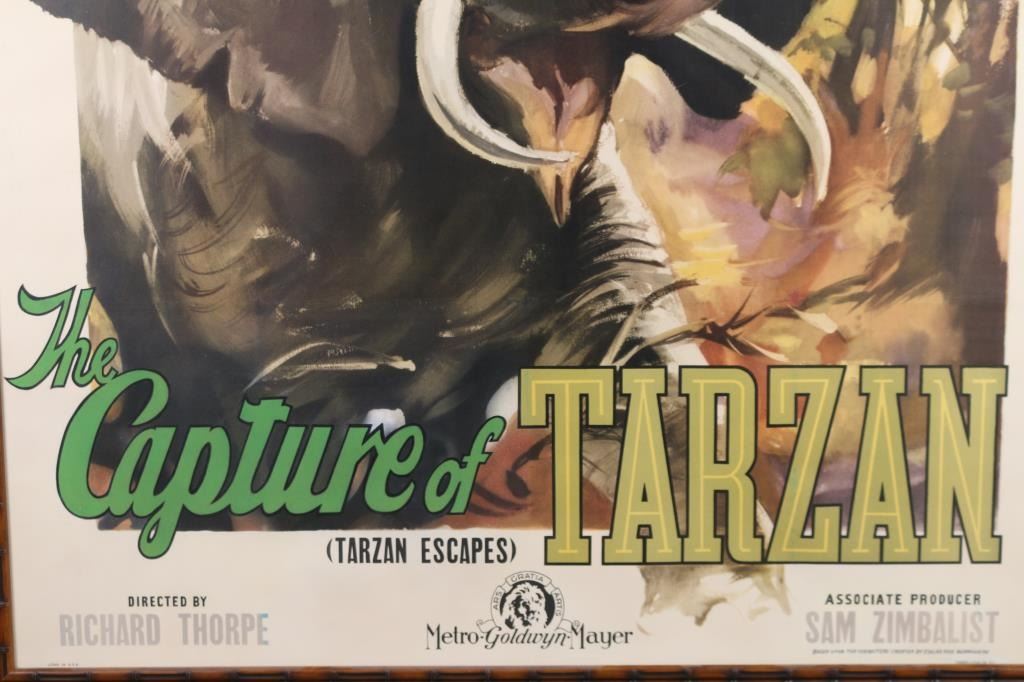 4-1/2' X 6-1/2' dimensions. The Golden Age of Film Era poster "The Capture of Tarzan (Tarzan Escapes)", starring Johnny Weissmuller and Maureen O' Sullivan. Marked lower right, "Tooker Litho Co. N.Y." Expertly cleaned and restored by Musso. Very rare size made for high visibility theaters like Grauman's Chinese theater. Framed in simulated dark bamboo. From the Joseph Musso Collection
