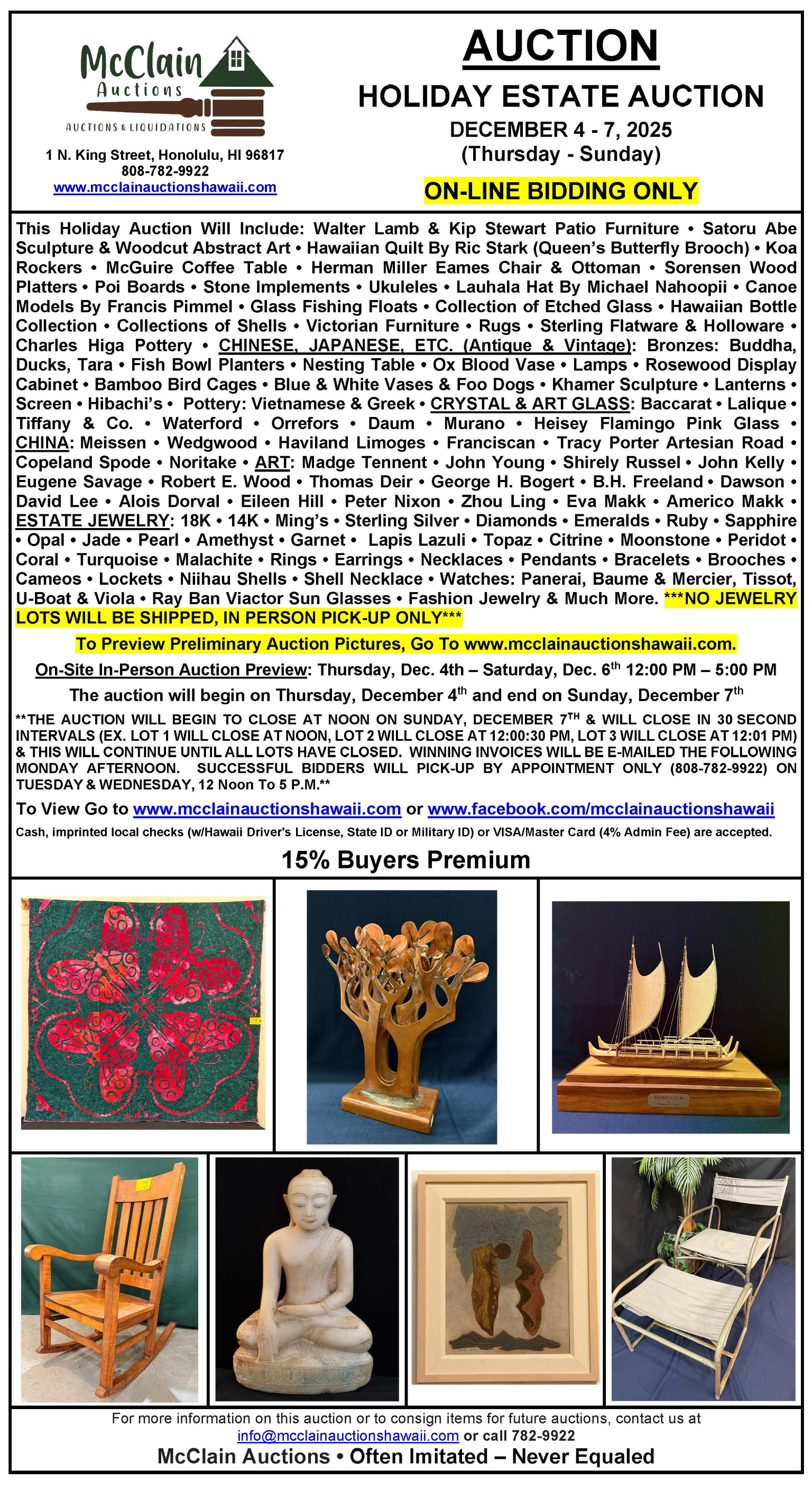 A fine collection from noteworthy local estates featuring antique, vintage and contemporary Oriental, European and American furnishings, bronzes, carpets, lamps, island dining sets, Hawaiiana, books and noted porcelain, crystal, sterling silver, gold jewelry and jades.