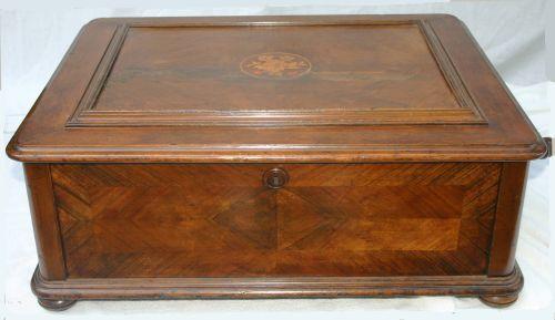 Lochman Style 128 music box with bars. Duplex combs, twelve tube type bars, speed control, veneered figured walnut case with reeded corner moldings, flattened bottom feet. 25" wide. Comes with six discs.