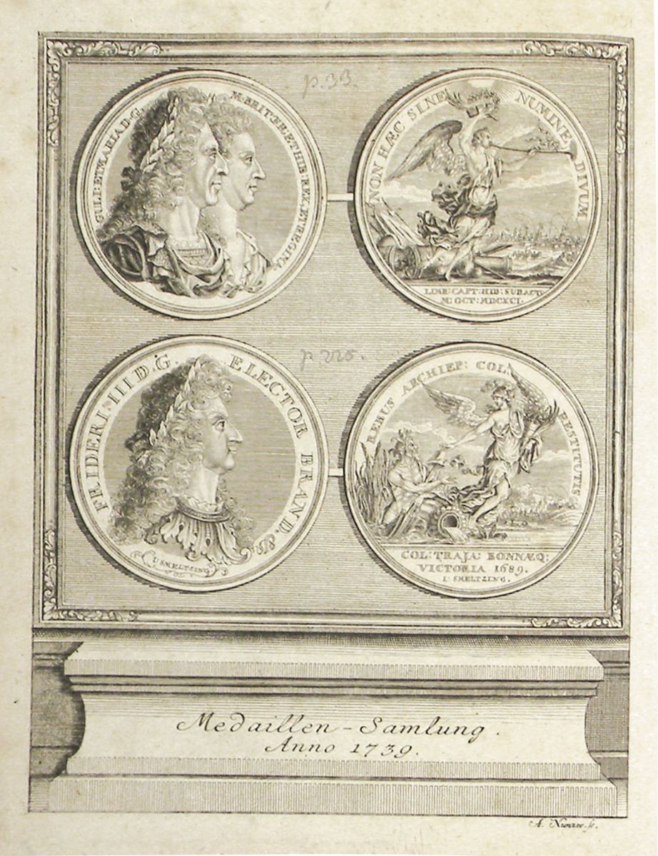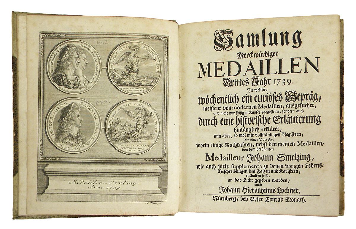 Lochner, Johann Hieronymus. SAMLUNG MERKWÜRDIGER MEDAILLEN. DRITTES JAHR 1739... MEISTEN MEDAILLEN, VON DEM BERÜHMTEN MEDAILLEUR JOHANN SMELZING... Nürnberg, (1739). 4to [20.5 by 17.5 cm], contemporary half vellum; spine lettered by hand; all page edges red. Finely engraved frontispiece by A. Nunzer; (46), 424, (40) pages; dedication vignette also by Nunzer; engraved text illustrations; folding engraving of a medal of Charles II; folding genealogical table. Finely engraved armorial ex libris. Edges worn; near fine. See catalogue for full description.