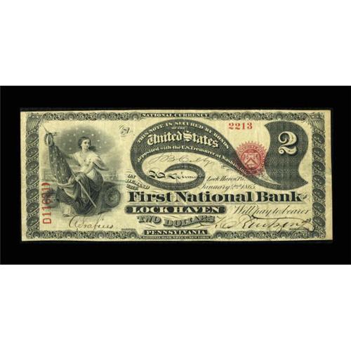 <B>Lock Haven, PA</B></I> - $2 Original Fr. 387 <B>The First NB</B></I> Ch. # 507<BR> This is the sole Lazy Deuce reported to date from this Clinton County bank. Fortunately for collectors, it's an attractive mid-grade piece with decent margins, bold pen signatures, and plenty of eye appeal. <B>Very Fine.</B></I><BR><BR><b>Shipping:</b> Coins & Currency (<a target="_blank" href="http://www.heritageauctions.com/common/shipping.php">view shipping information</a>)