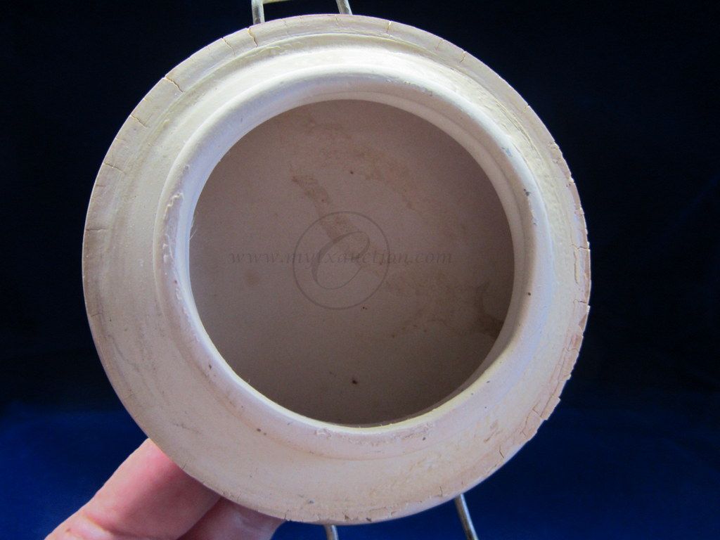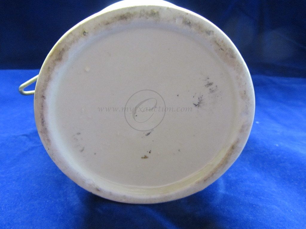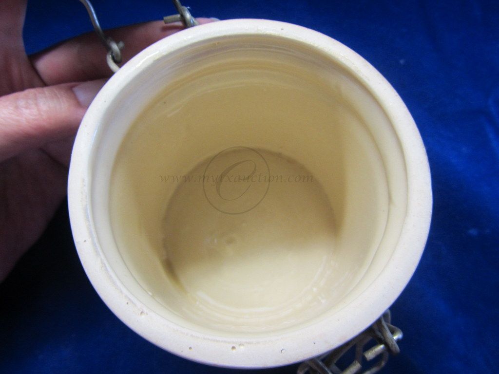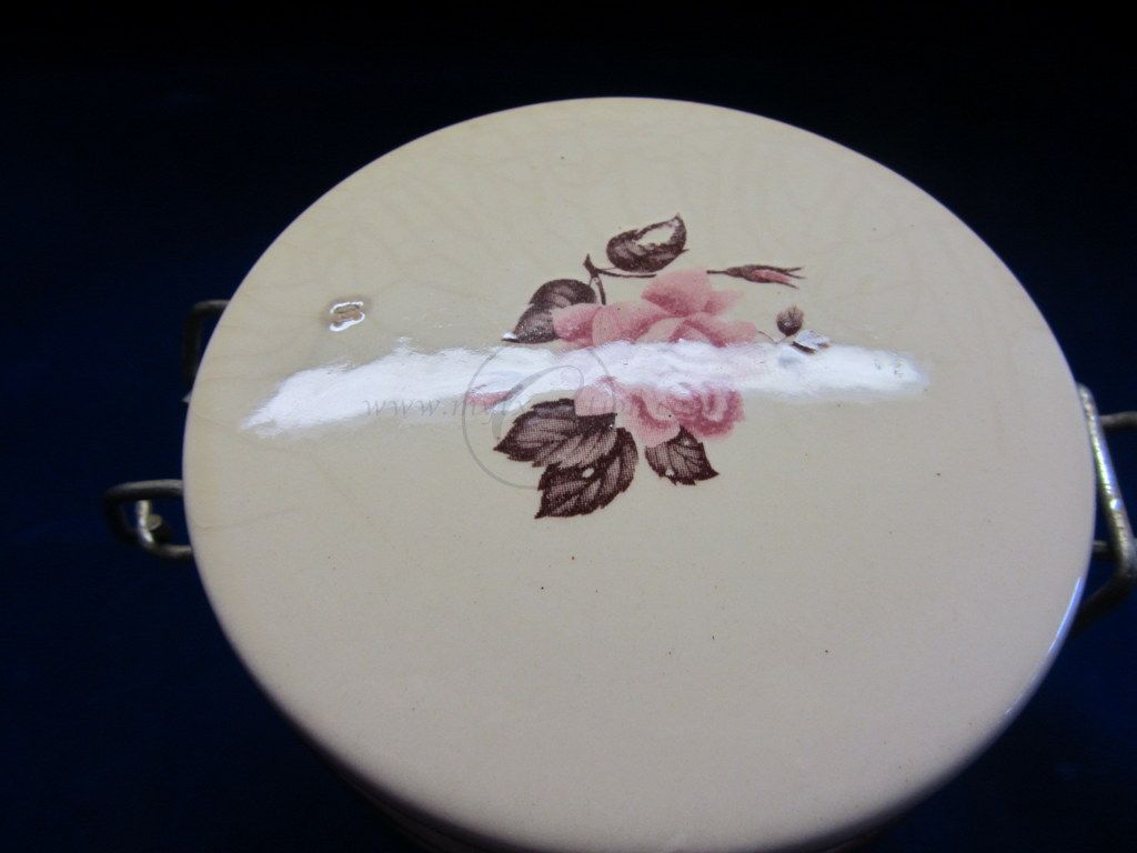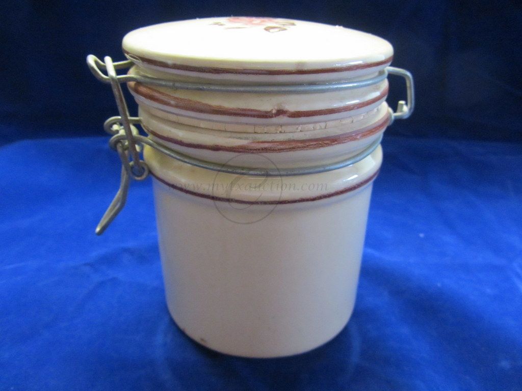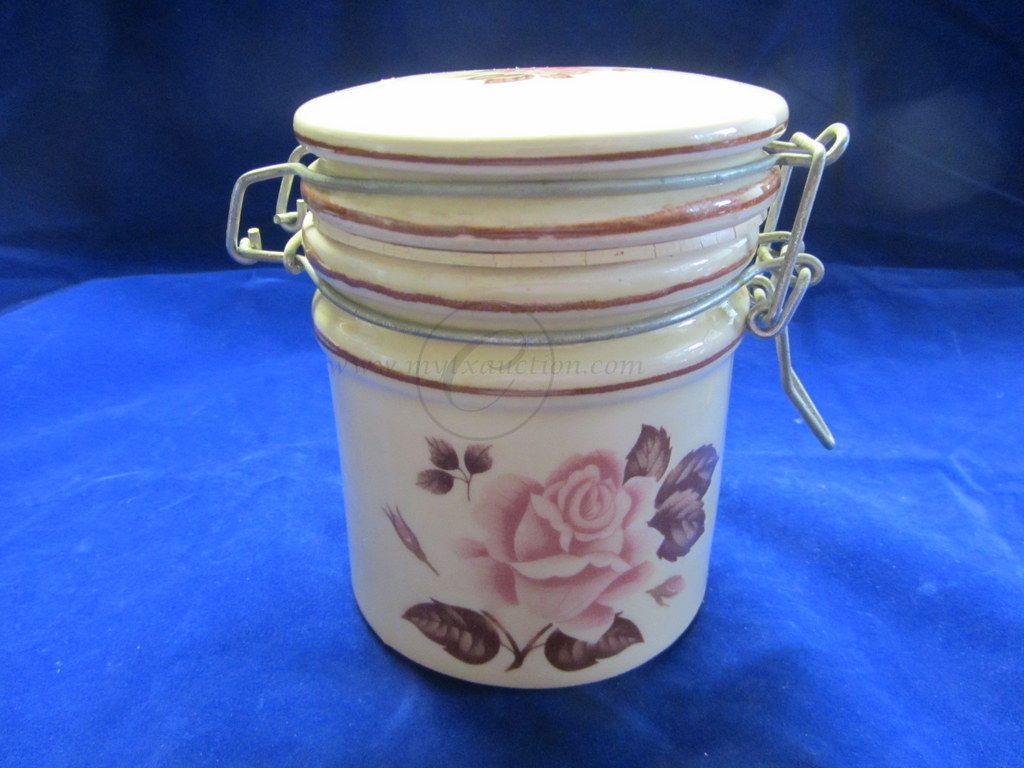 Beige colored with rose design lock-lid canister, very pretty vintage piece. Measures 5" tall x 4" across, crazing is present in this piece showing the age. NOTE: needs new rubber seal