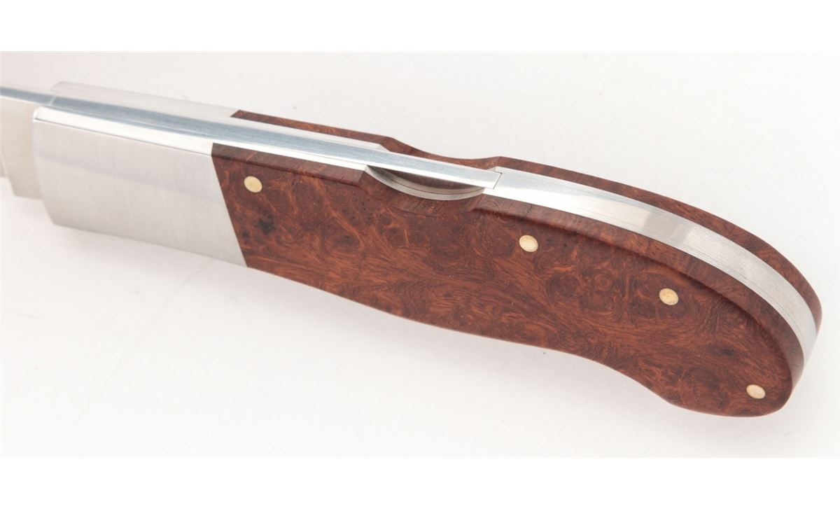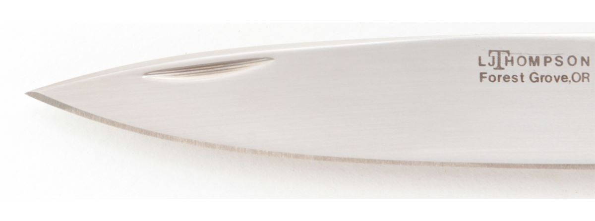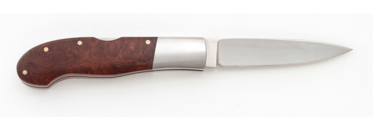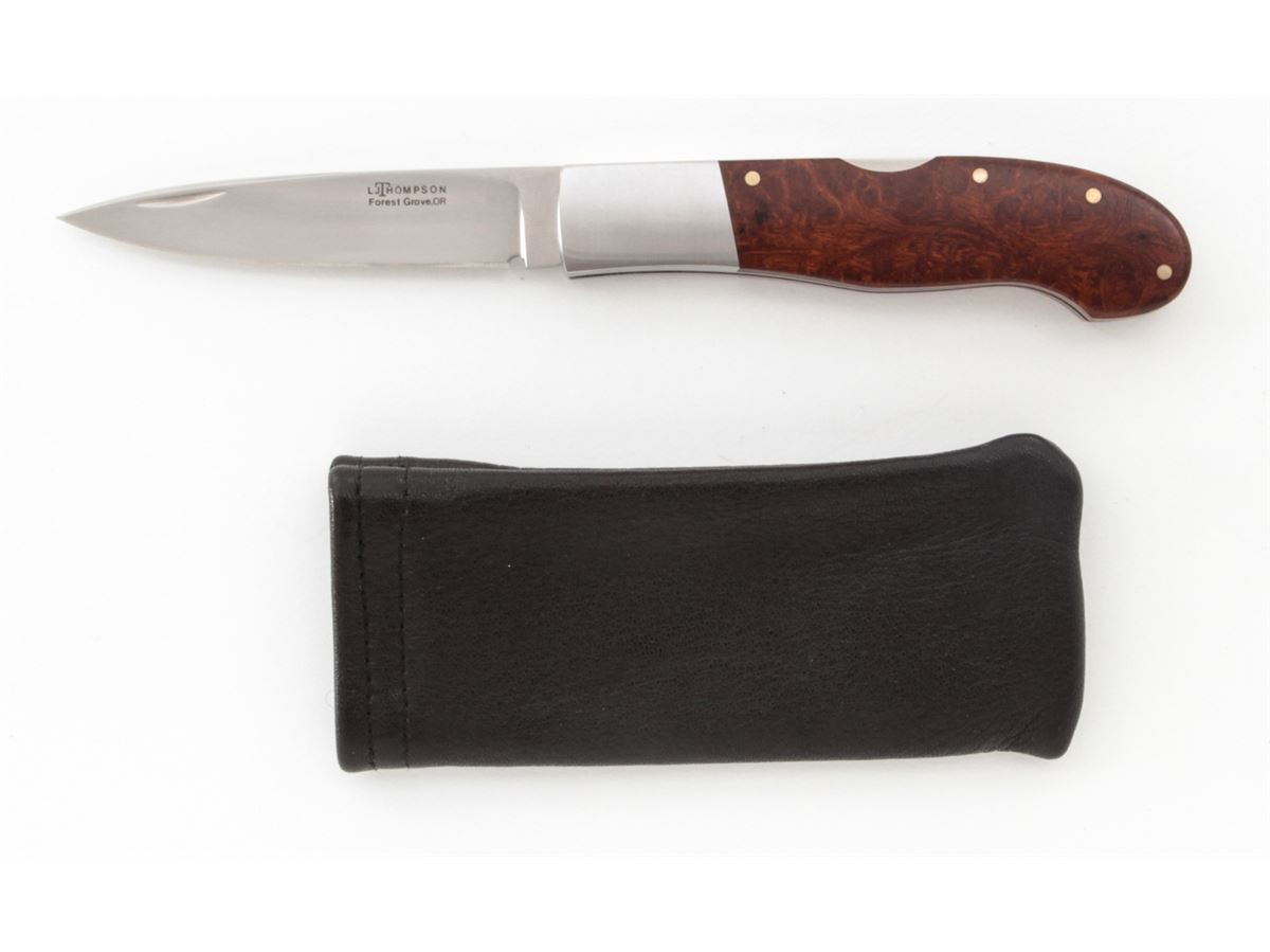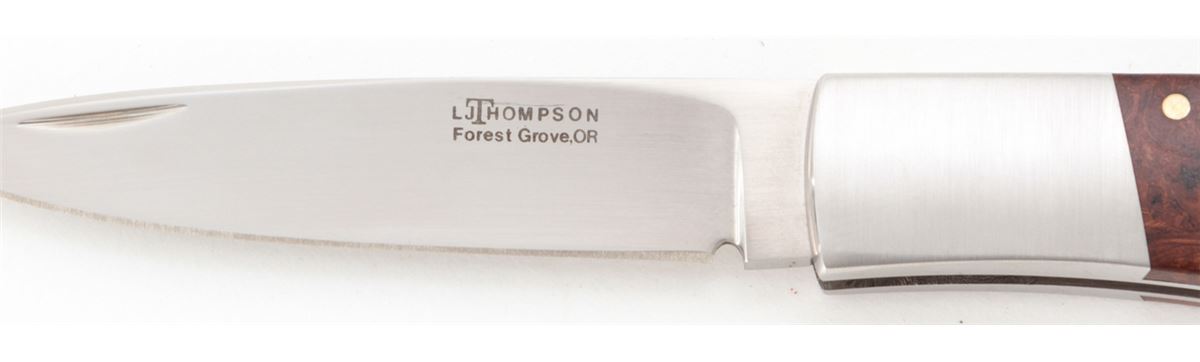 Lockback Folding Knife, by L.J. Thompson, 3-1/4'' drop-point blade marked ''LJ THOMPSON/Forest Grove, OR.''; 4'' overall closed length, satin stainless steel bolsters, desert iron wood scales, with nickel silver pins. Condition is excellent appearing as new and showing no use, with very few light marks from handling. Est.: $225-$350. (Ian Shein estate)