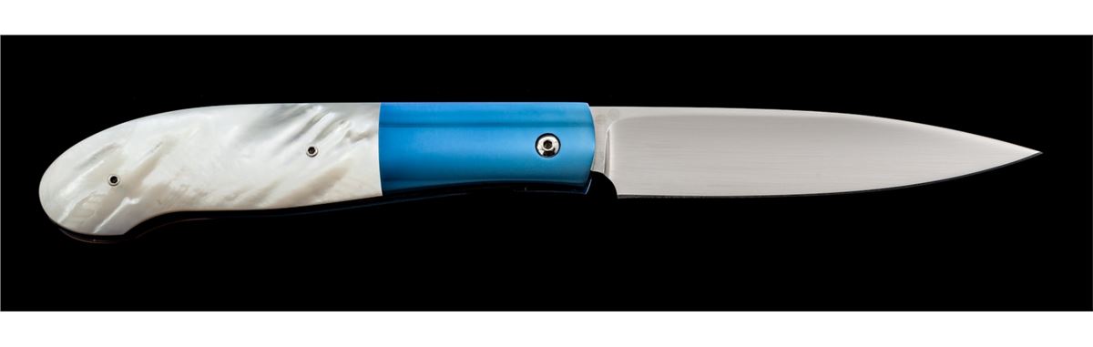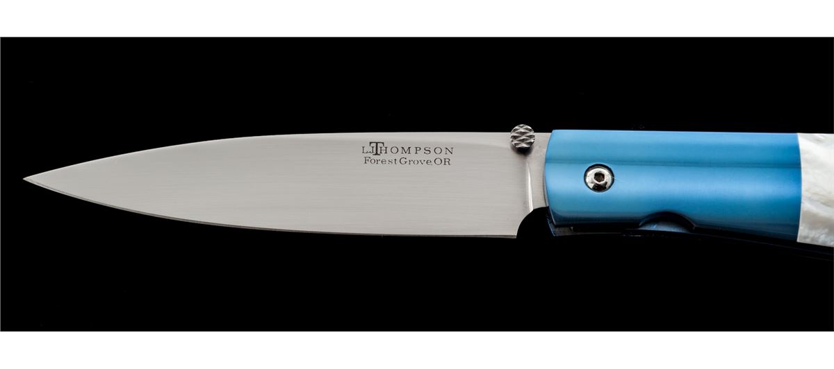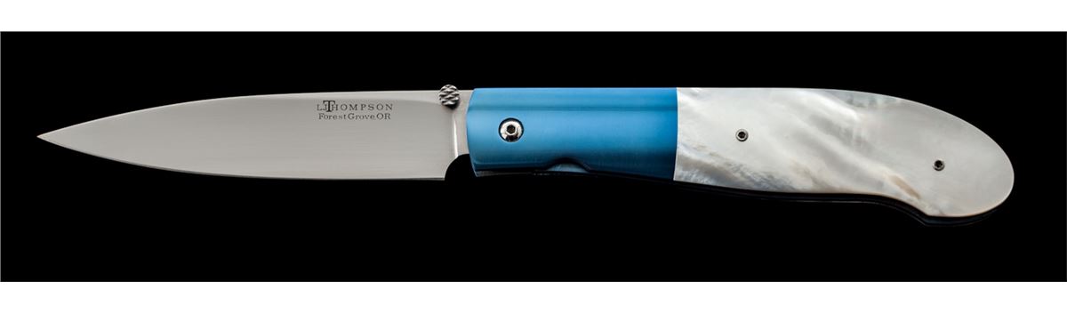 Lockback Folding Knife, by L.J. Thompson, 3-1/2'' drop-point blade marked ''LJ THOMPSON/Forest Grove, OR.''; 4-3/8'' overall closed length, blue titanium bolsters and liners, pearl scales, with hex head hardware. Condition is excellent appearing as new and showing no use. Blue titanium parts with very few light marks from handling. Est.: $350-$550. (Ian Shein estate)