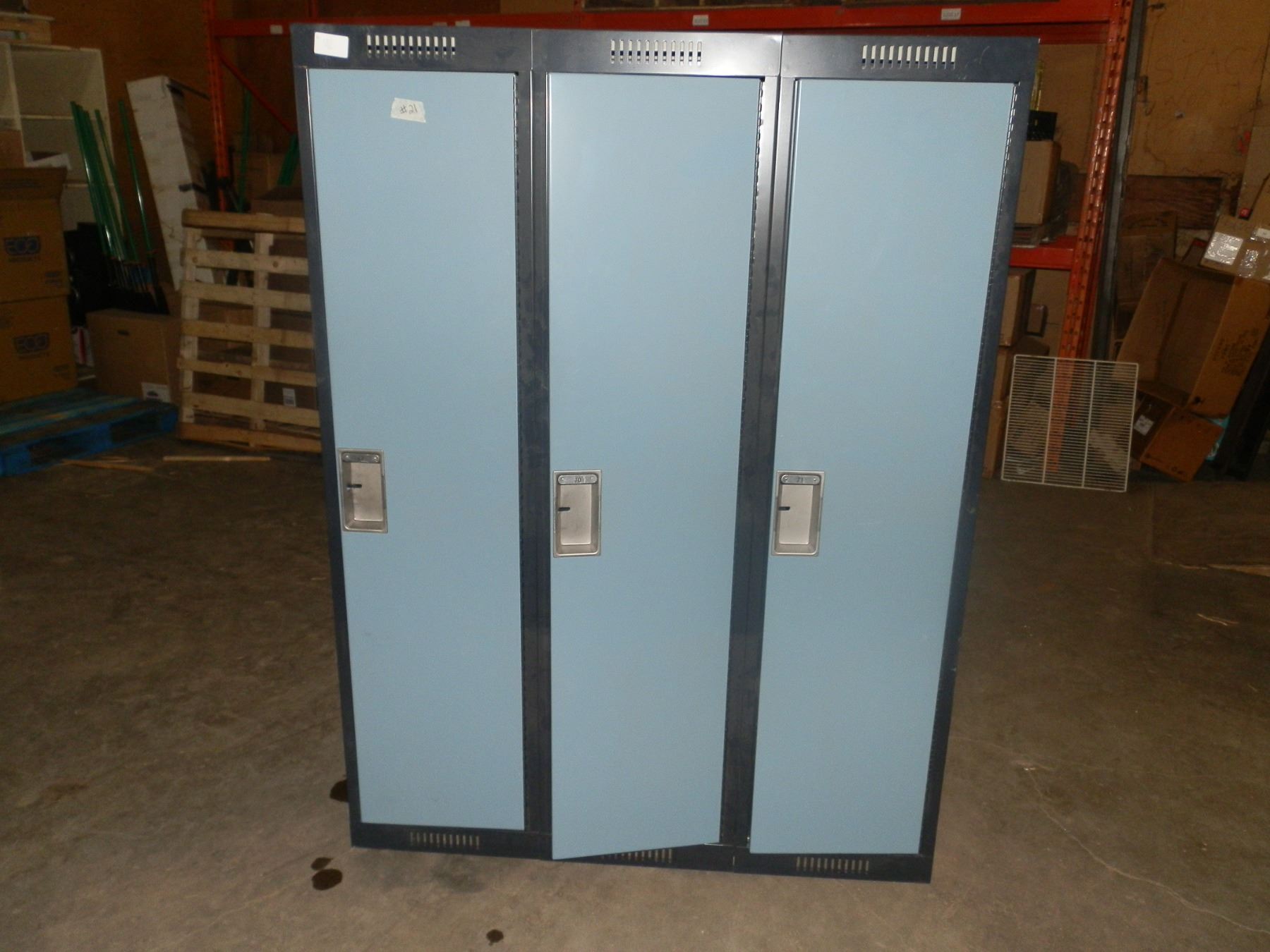 Blue lockers, 1 bank of 3.. Note.. these lockers are oversized at 16" inches... in good condition...used
