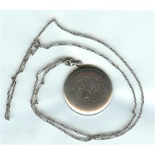 Holding 4 pictures this sterling locket is engraved on the front with the initials "EAL" The "A" being the largest and in the middle. 1.1/4" across. The chain is original and measures 25" in length. Some scratches. Marked inside "Pat.Oct21.1902. L&M. Sterling"