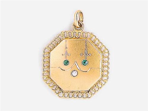 14 K gold, octagonal form locket, glass bead decoration, circa 1900, marked, weight: 4.4 g.
