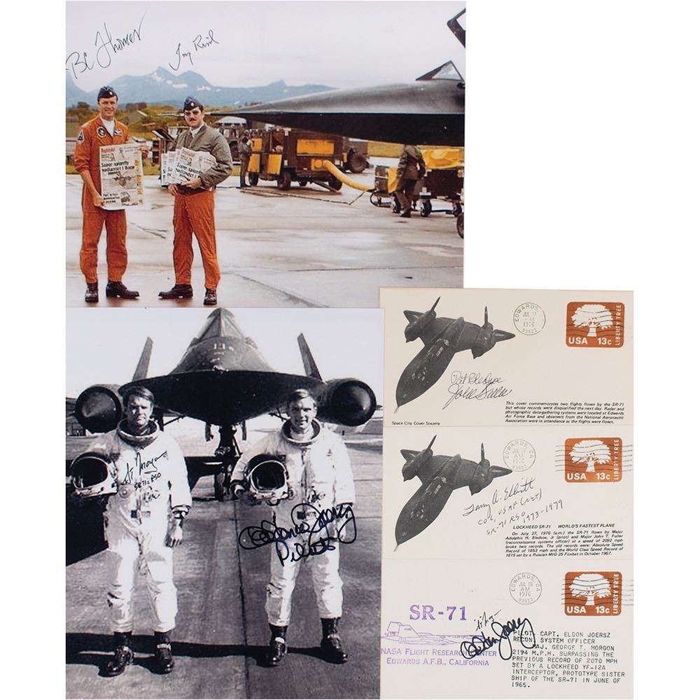 Five items signed by SR-71 Blackbird crew members, including: record-setting flight covers signed by Pat Bledsoe and John Fuller, Larry A. Elliot, and Eldon Joersz; a color satin-finish photo of B. C. Thomas and Jay Reid after their forced landing in Norway, signed in black felt tip by both; and a glossy 8 x 10 photo of Eldon Joersz and George Morgan after their record-setting flight, signed in black felt tip by both. In fine condition, with rather grainy/pixelated image quality to the photos.