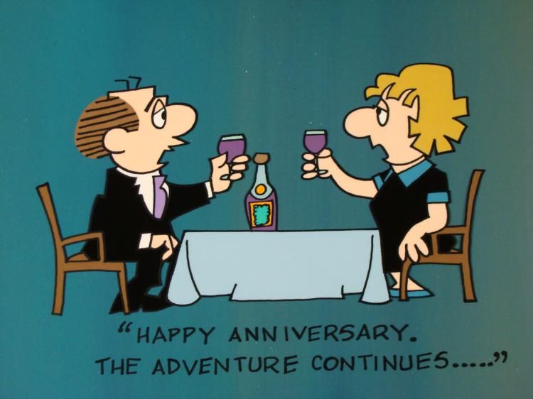 Here is an original animation model cel was used in the production of the cartoon the Lockhorns. This lovely couple is enjoying their wine and celebrating there anniversary together. The caption on the cel reads: "HAPPY ANNIVERSARY.