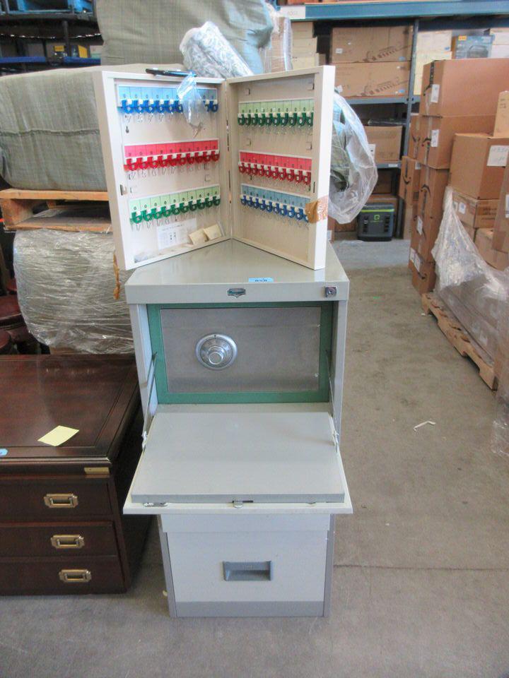 key only, no combination . File cabinet safe measures 18" wide x 25" deep x 40" tall.