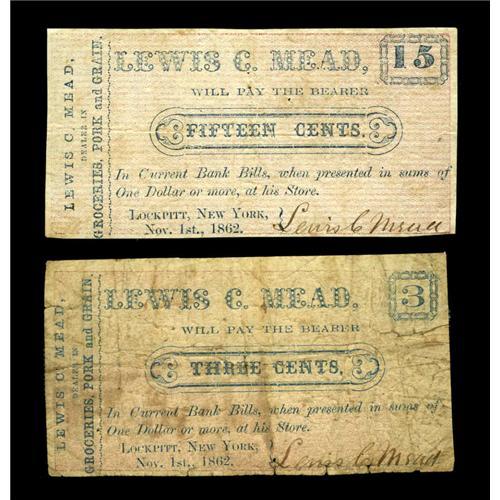 <B>Lockpitt, NY- Lewis C. Mead</B></I> 3¢, 15¢ Nov. 1, 1862 Harris 4, 7<BR>The only two denominations listed from this dealer in groceries, pork and grain. The 15¢ note is the Harris plate example. The town name is not, apparently, a misprint of "Lockport," but is a Wayne County hamlet then also known as Meadeville. <B>Very Good,</B></I> with some tape repairs, <B>Very Fine.</B></I>