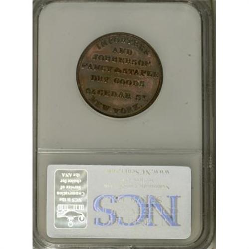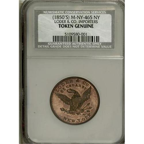 <B>(1850s) Loder & Co. Merchant Token. NCS Genuine.</B></I> Miller-NY-465. Copper. This lustrous token appears to grade Choice Mint State, but both sides are coated with lacquer. Predominantly red with glimpses of ice-blue on the reverse.<BR><BR><b>Shipping:</b> Coins & Currency (<a target="_blank" href="http://www.heritageauctions.com/common/shipping.php">view shipping information</a>)
