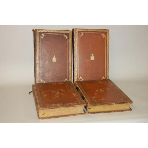 Lodge, Edmund [Biographical and Historical Memoirs by]. Portraits of Illustrious Personages of Great Britain - 4 Volumes. London: Lackington, Hughes, Harding, Mavor, and Lepard, First Edition. Elephant Folio - over 15" - 23" tall. Hard Cover. Ex-Library. Fair to Good Condition. 1821-1834. Complete with 240 engraved, tissue guarded plates, with descriptive text. Includes the List of Subscribers. Bound in gilt decorated leather, raised bands on spine, brown leather spine labels, aeg, inner gilt borders with blind stamping. BINDINGS TIGHT. A few covers detached, upper/lower backstrip wear/tear, corner/edge wear, interior foxing, edge water stain in one volume (not affecting the portraits)