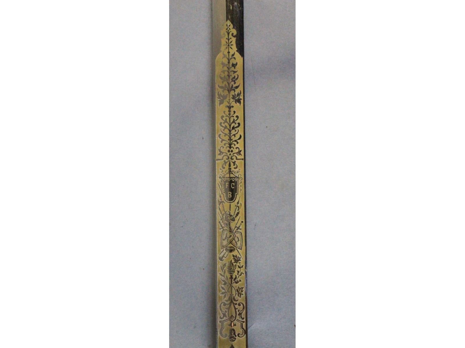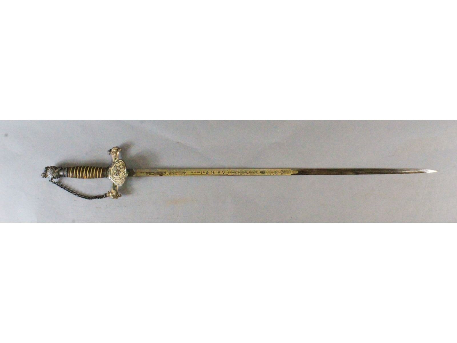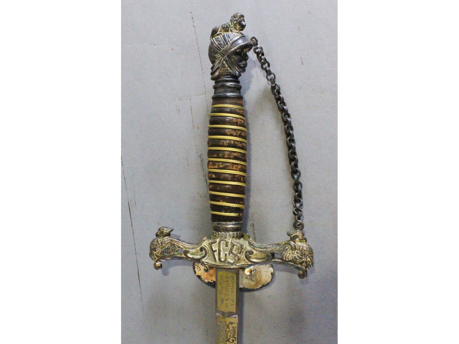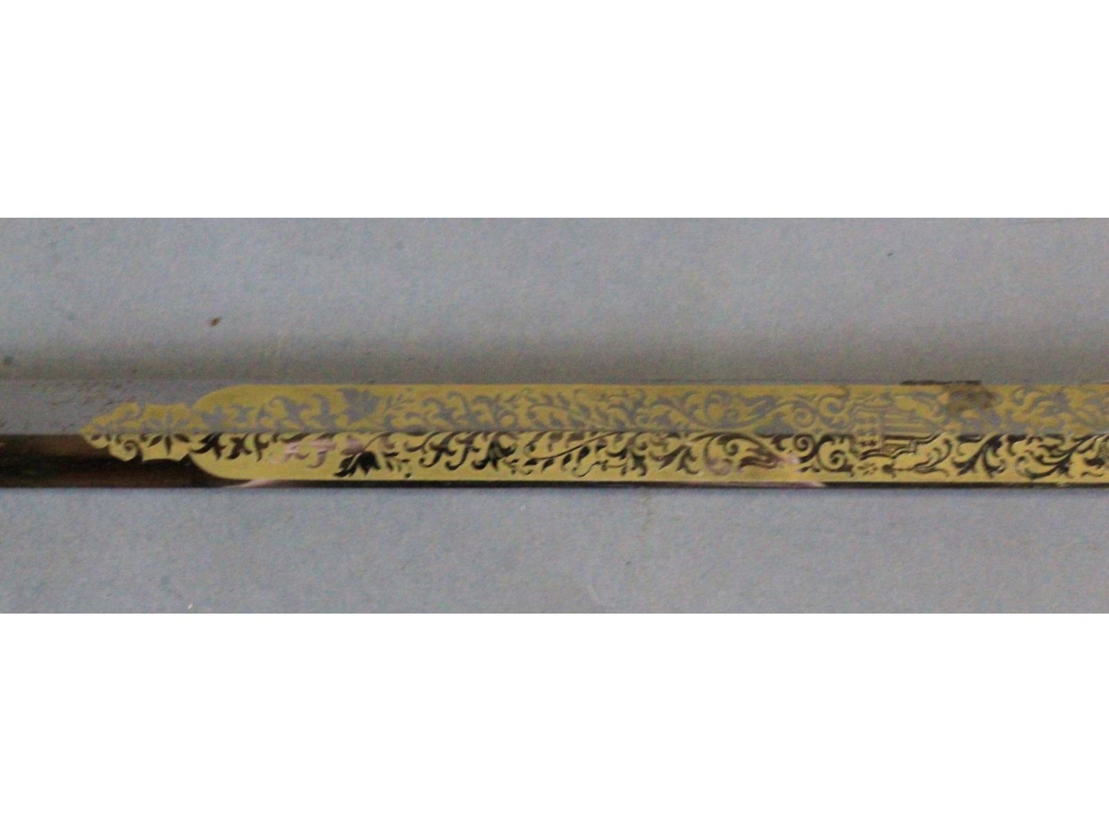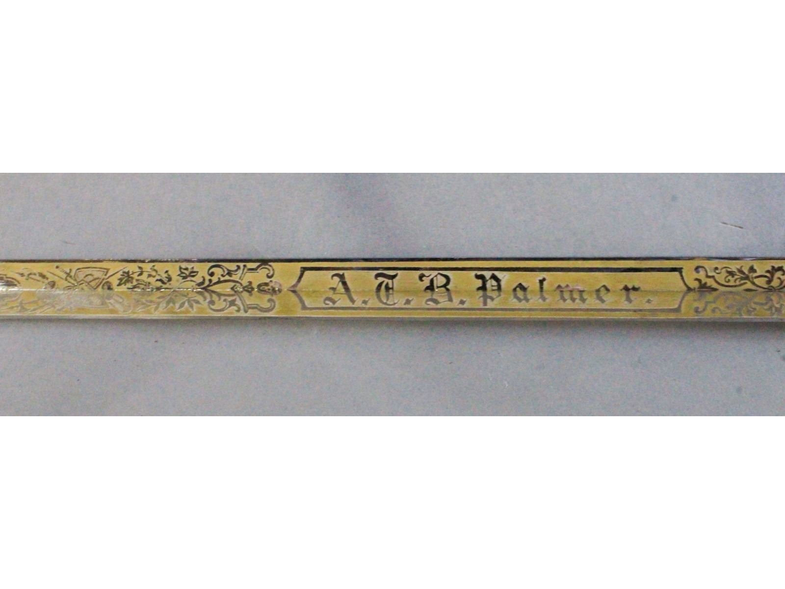 Blade is very nice, etched in gold with the owners name, A T R Palmer. Also marked MC Lily Company, Columbus, Ohio. Hilt is missing most of it's original gold plating. Leather grip with brass wire. Leather has some scuffs in it. Chain guard. Nickel plated scabbard with fancy mounts, no dents. Good to very good condition.